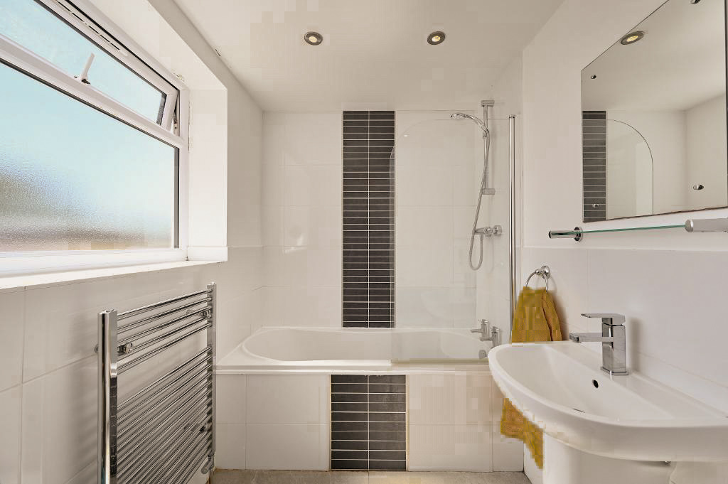 The heart of this home is its impressive modern kitchen, featuring sleek white cabinetry, integrated appliances, a double oven, and elegant black countertops. Tiled flooring and large windows ensure a bright, airy space perfect for both daily living and entertaining. The adjoining utility room is equipped with modern appliances and garden access, blending functionality with style. Each bedroom is thoughtfully designed to maximise comfort and light. The principal bedrooms offer large windows, built-in storage, and warm wooden flooring, while the attic room, with its Velux window and clever built-in shelving, provides a unique retreat ideal for a study or playroom. Both bathrooms are luxuriously appointed, each boasting a contemporary walk-in shower, chrome heated towel rail, ample natural light, and sleek fixtures for a spa-like experience.