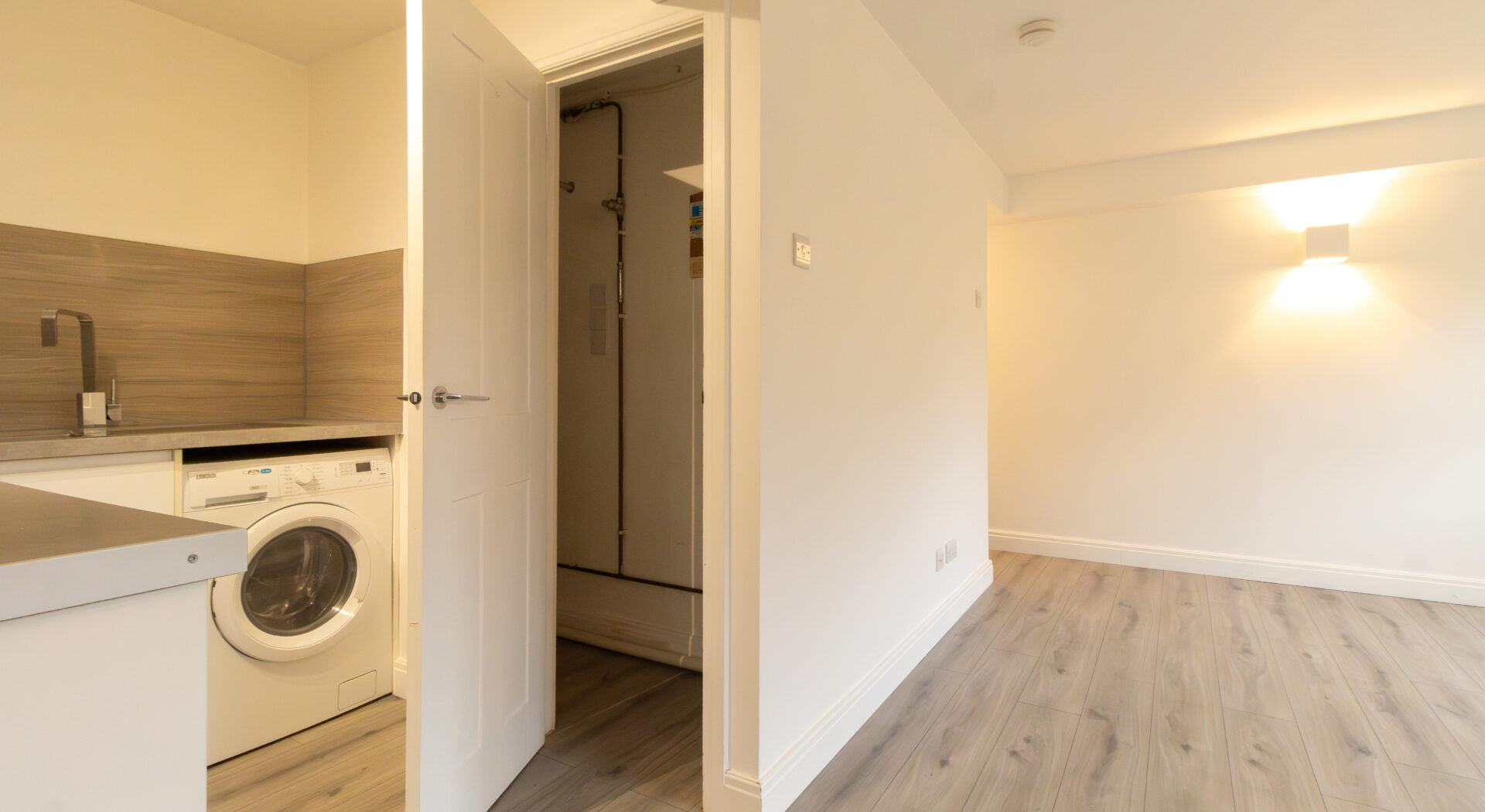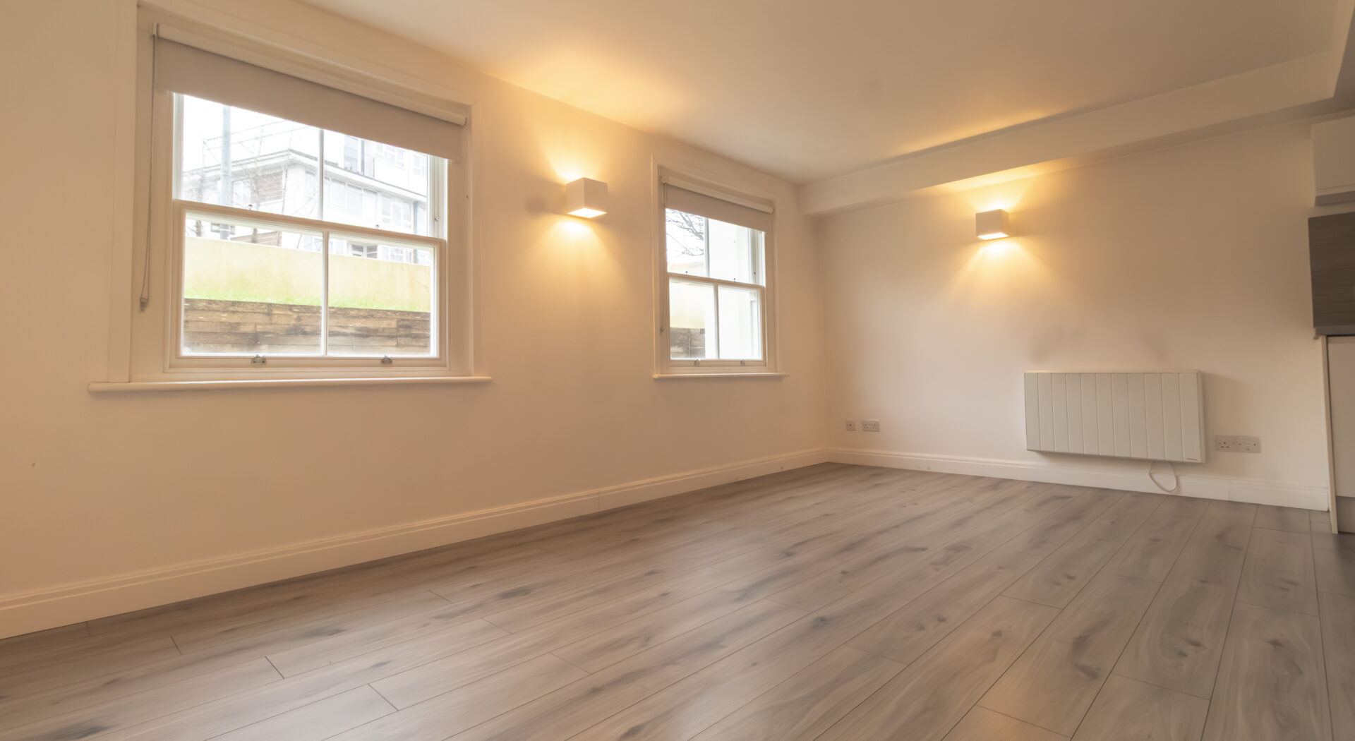 Additional features include a compact utility area and modern laminate flooring, optimising both functionality and style. The contemporary bathroom is equipped with high quality fixtures, a walk in shower, and a heated towel rail, providing comfort and a touch of luxury. Throughout the property, contemporary wall mounted lighting enhances the atmosphere, while the minimalist design and neutral palette offer a timeless appeal. This studio is ideally suited to those seeking a modern, low maintenance home with a high standard of finish, making it an attractive option for professionals or individuals who value both style and practicality. With its efficient layout, abundance of natural light, and quality fixtures, this property represents a superb opportunity for comfortable modern living.