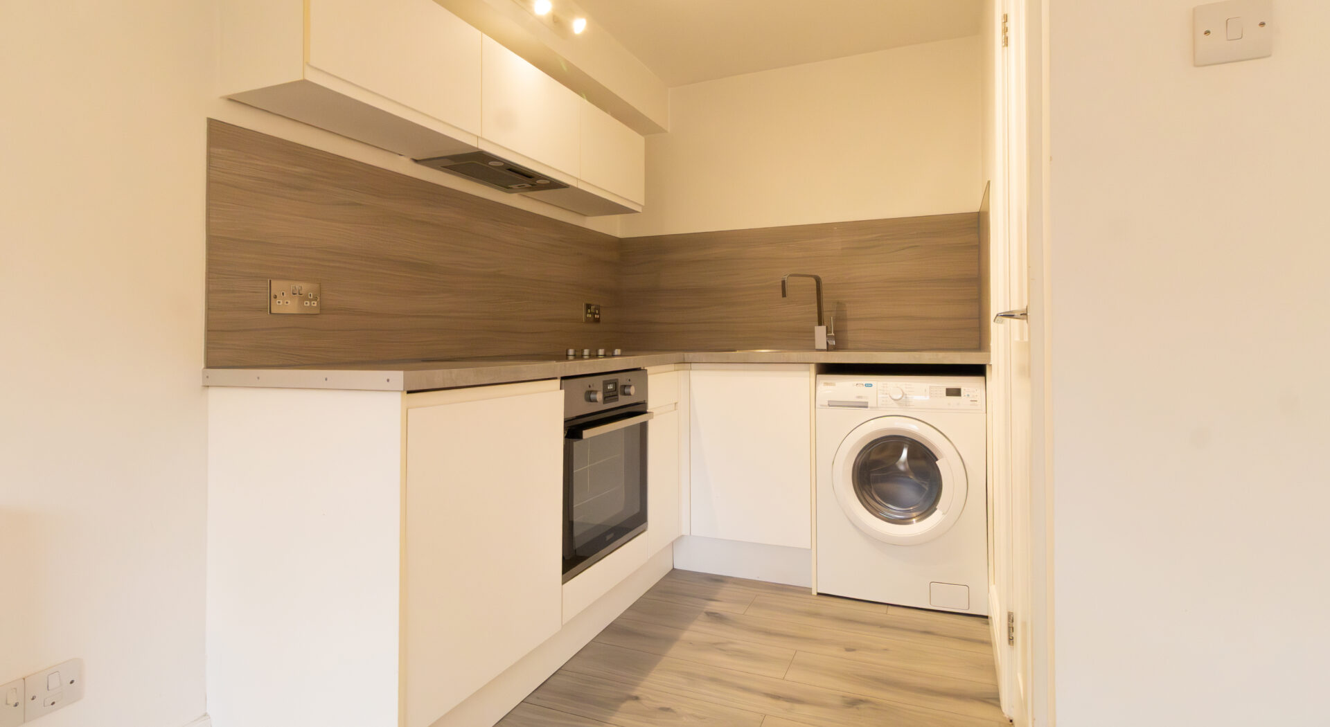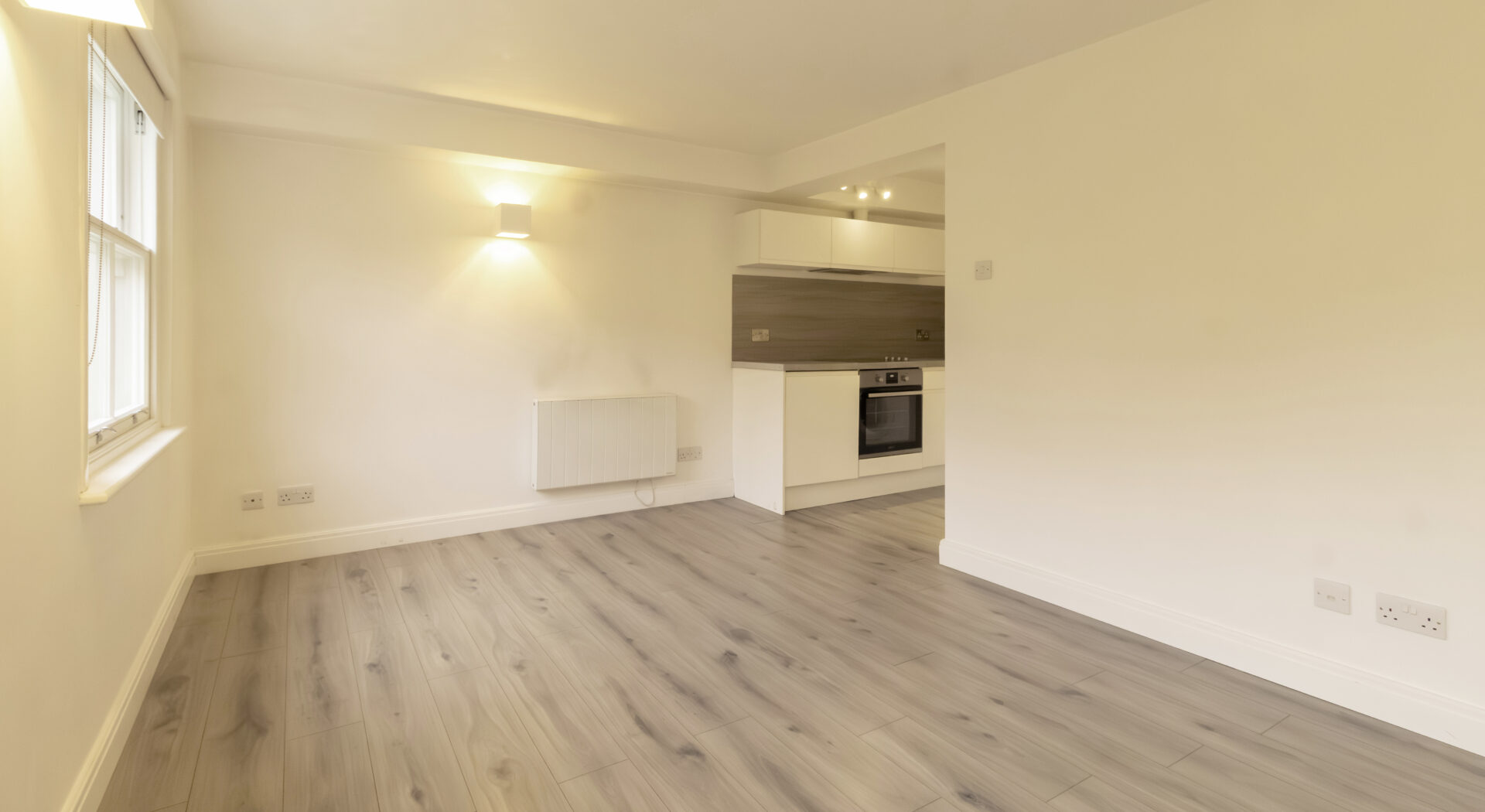 A range of modern studio apartments offering a thoughtfully designed layout, featuring one contemporary bathroom and an inviting open plan reception area. Upon entering, you are greeted by a stylish hallway with sleek modern flooring, neutral decor, and elegant wall lighting, setting the tone for the rest of the home. The main living area is bright and spacious, enhanced by large windows and polished wood flooring, creating a versatile setting perfect for both relaxation and entertaining. The open plan kitchen seamlessly blends with the living space, boasting modern units, an integrated oven, and ample natural light to create a warm and welcoming environment.