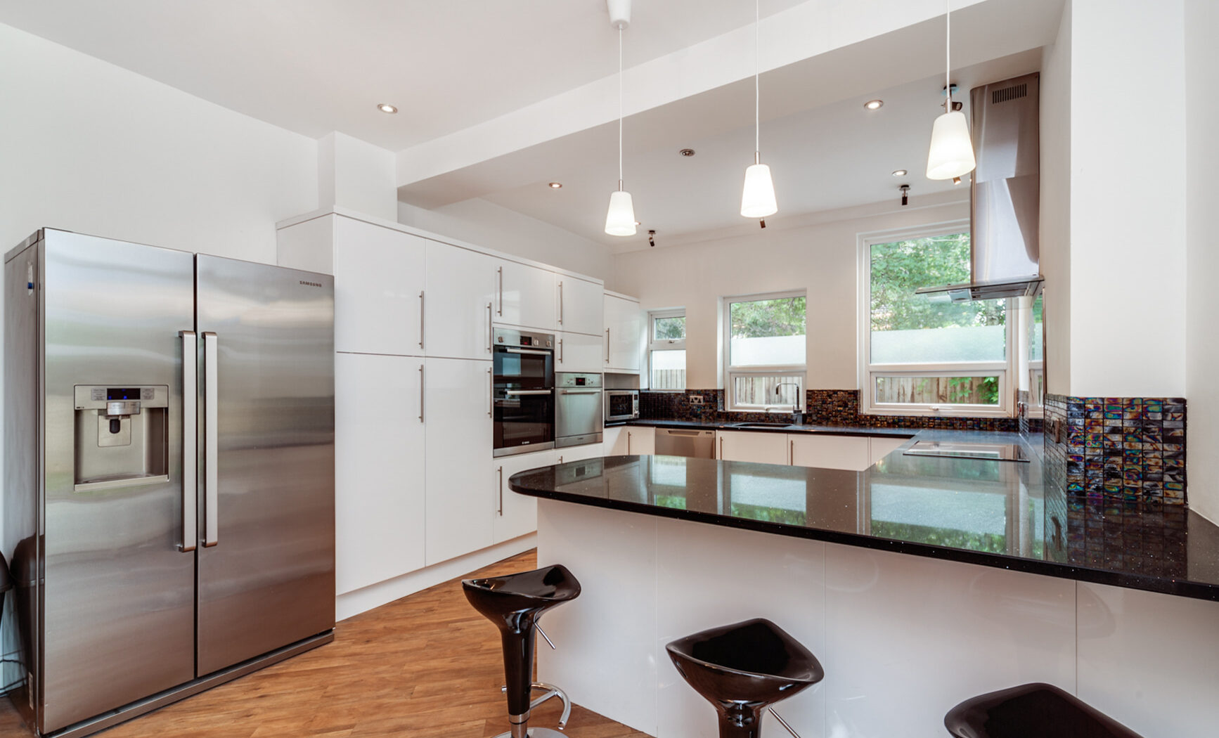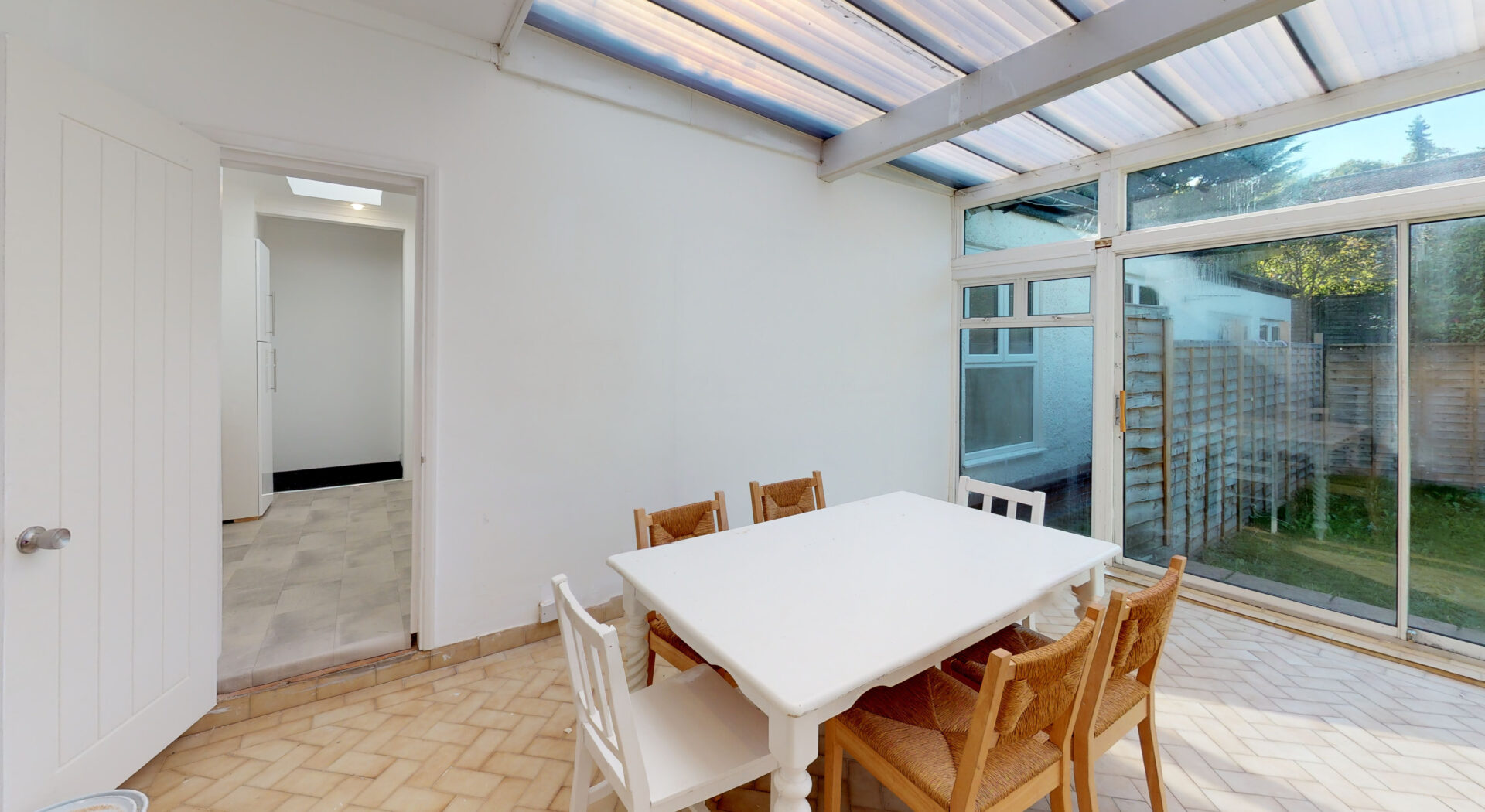 A true highlight of this home is its emphasis on contemporary living and entertaining. The modern kitchen is a chef’s dream, boasting sleek cabinetry, integrated appliances, a substantial island with breakfast bar seating, and chic pendant lighting. Multiple windows bathe the space in natural light, creating a welcoming hub for family gatherings or informal dining. The adjoining conservatory is flooded with sunlight from its translucent roof and opens directly to the garden via sliding doors, perfect for relaxing or hosting guests in an inviting indoor outdoor setting. The landscaped garden itself is a private retreat, featuring a well-maintained lawn ideal for children’s play or outdoor activities, a cosy patio area for al fresco dining, and lush greenery offering privacy and a peaceful ambience.
