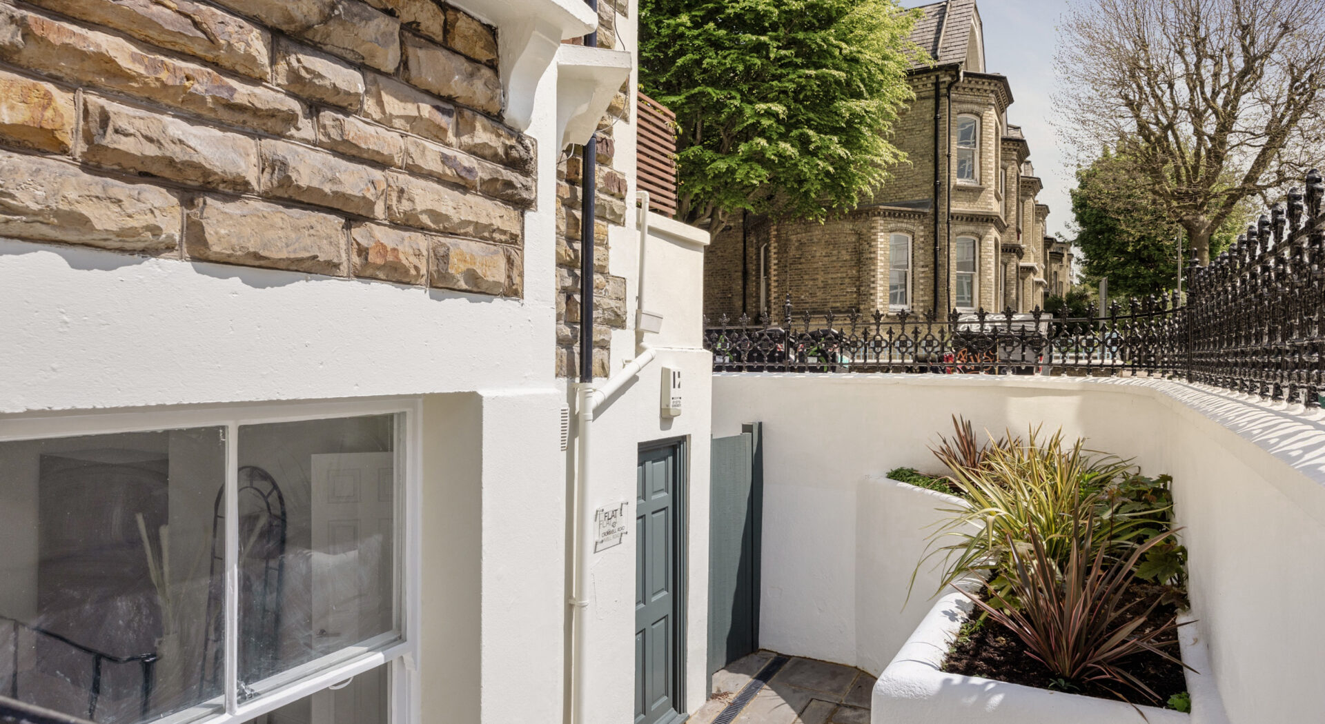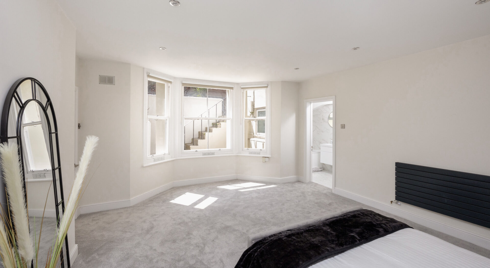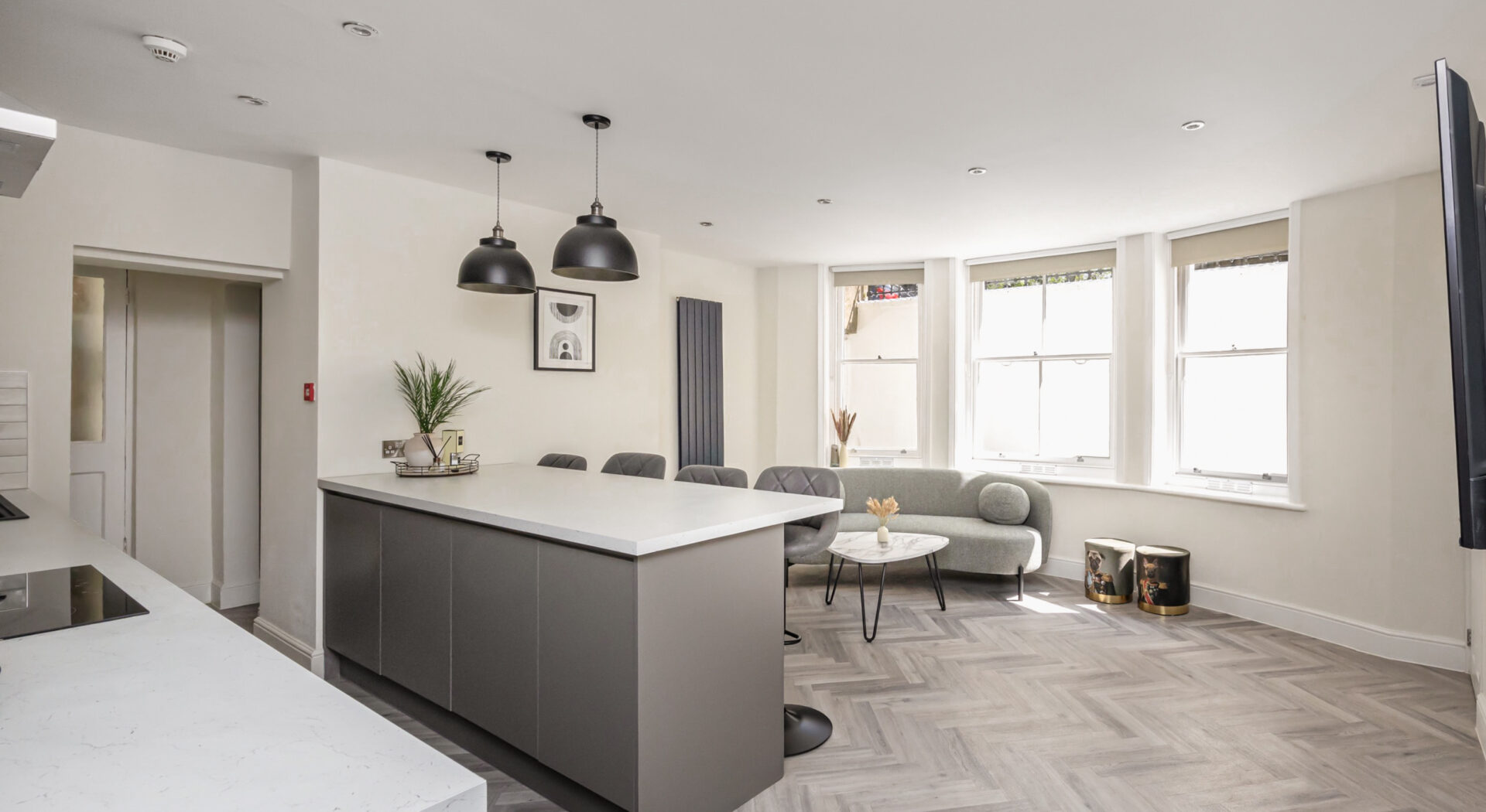 This exquisite two bedroom flat seamlessly blends period elegance with modern sophistication, creating a truly exceptional living environment. The property is introduced by a charming private entrance and classic stone facade, complemented by neatly maintained planter gardens for a welcoming first impression. Inside, spacious bedrooms are adorned with plush carpeting, neutral décor, and large windows including a striking bay window that flood each room with natural light, enhancing both comfort and style. The bedrooms further benefit from modern radiators, recessed lighting, and private en-suite facilities to the master, offering a serene retreat with a touch of luxury. The generously proportioned open plan kitchen and living area is the heart of the home, featuring sleek modern units, integrated appliances, and an expansive kitchen island with breakfast bar seating, perfect for casual dining or entertaining guests. Elegant herringbone flooring and stylish pendant lighting create a contemporary, inviting atmosphere, while large windows provide panoramic urban and scenic views.