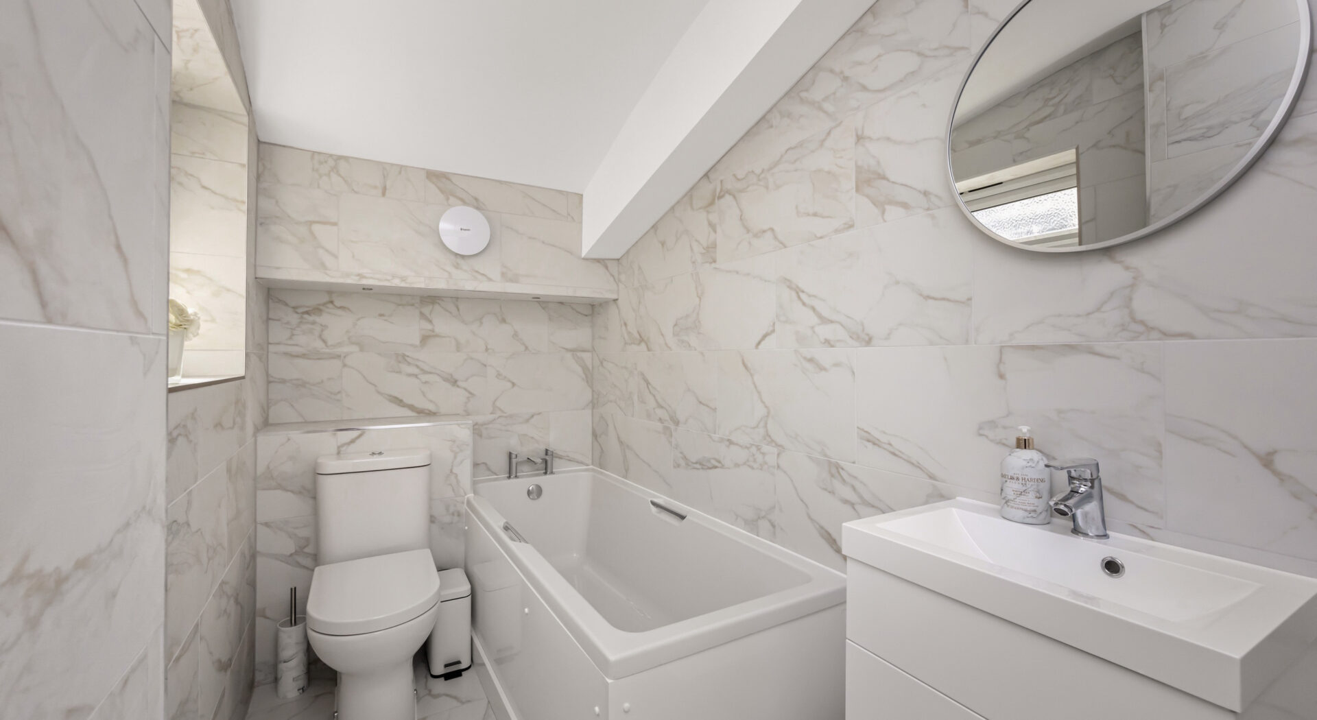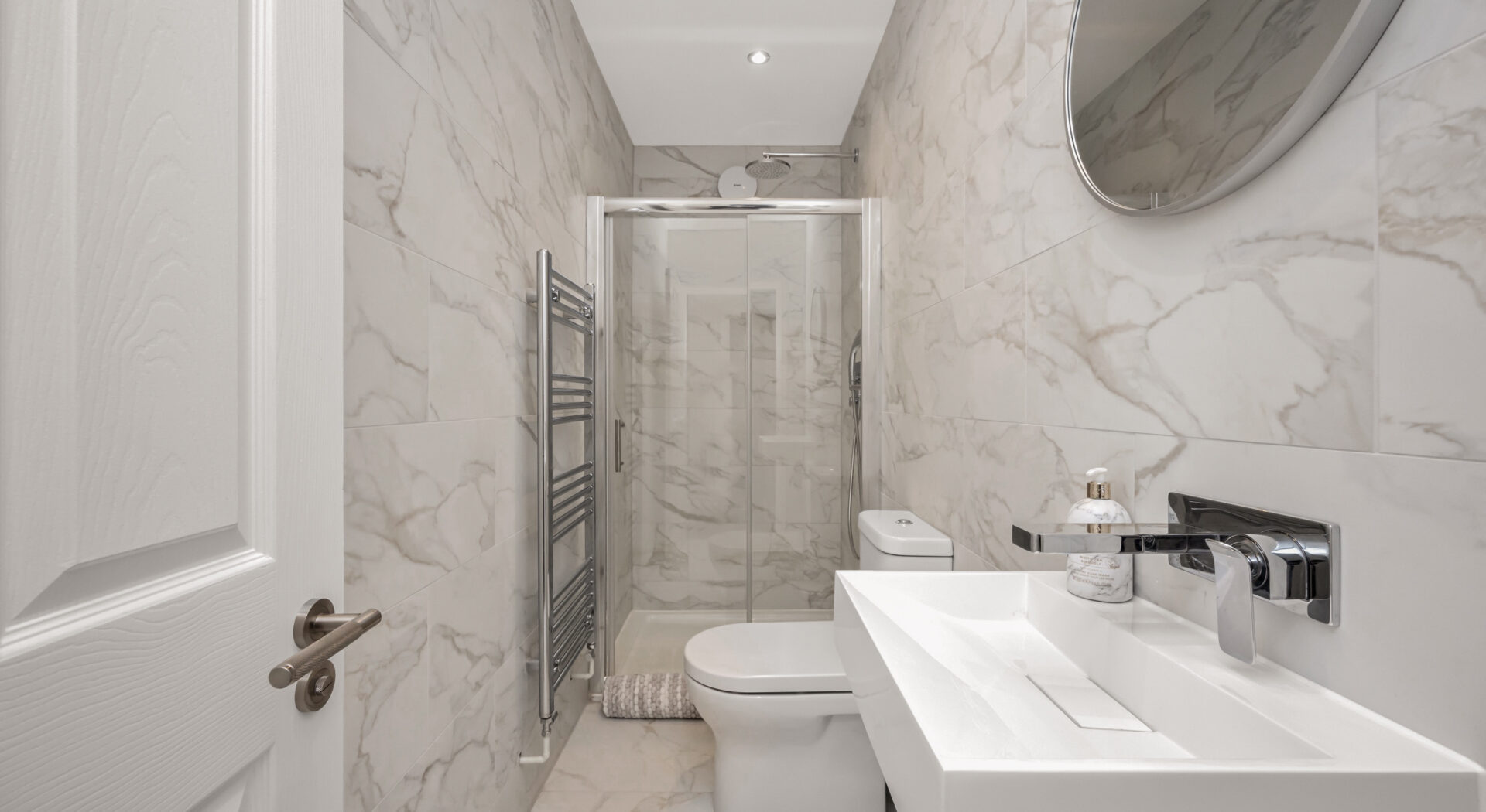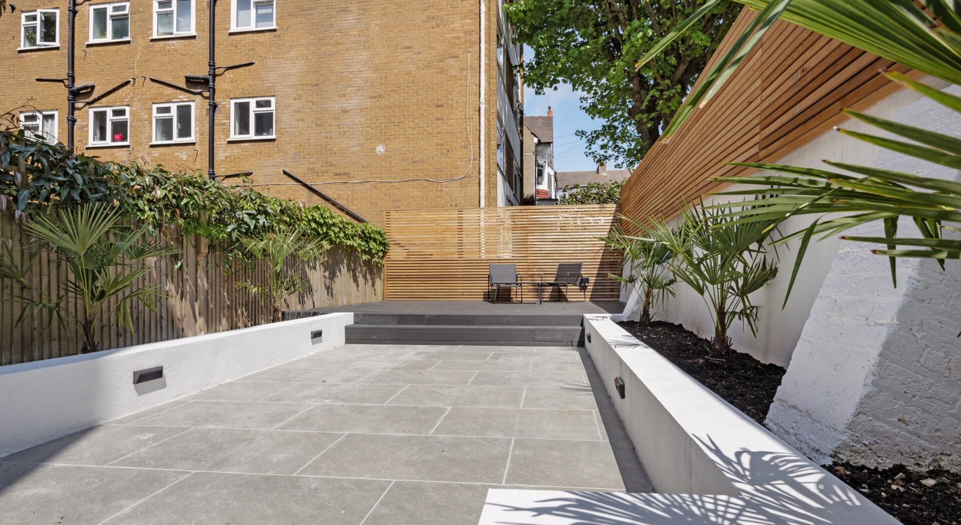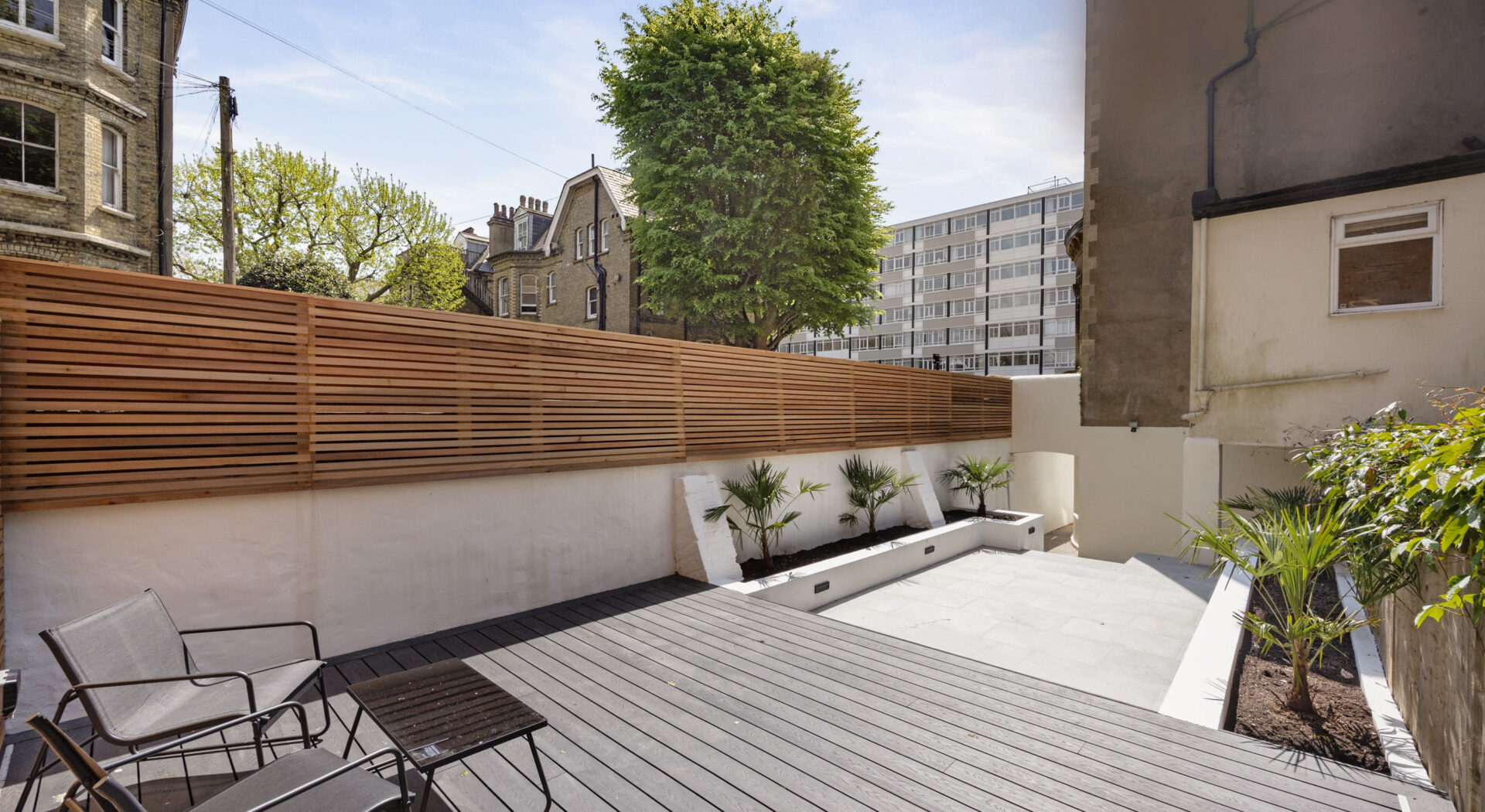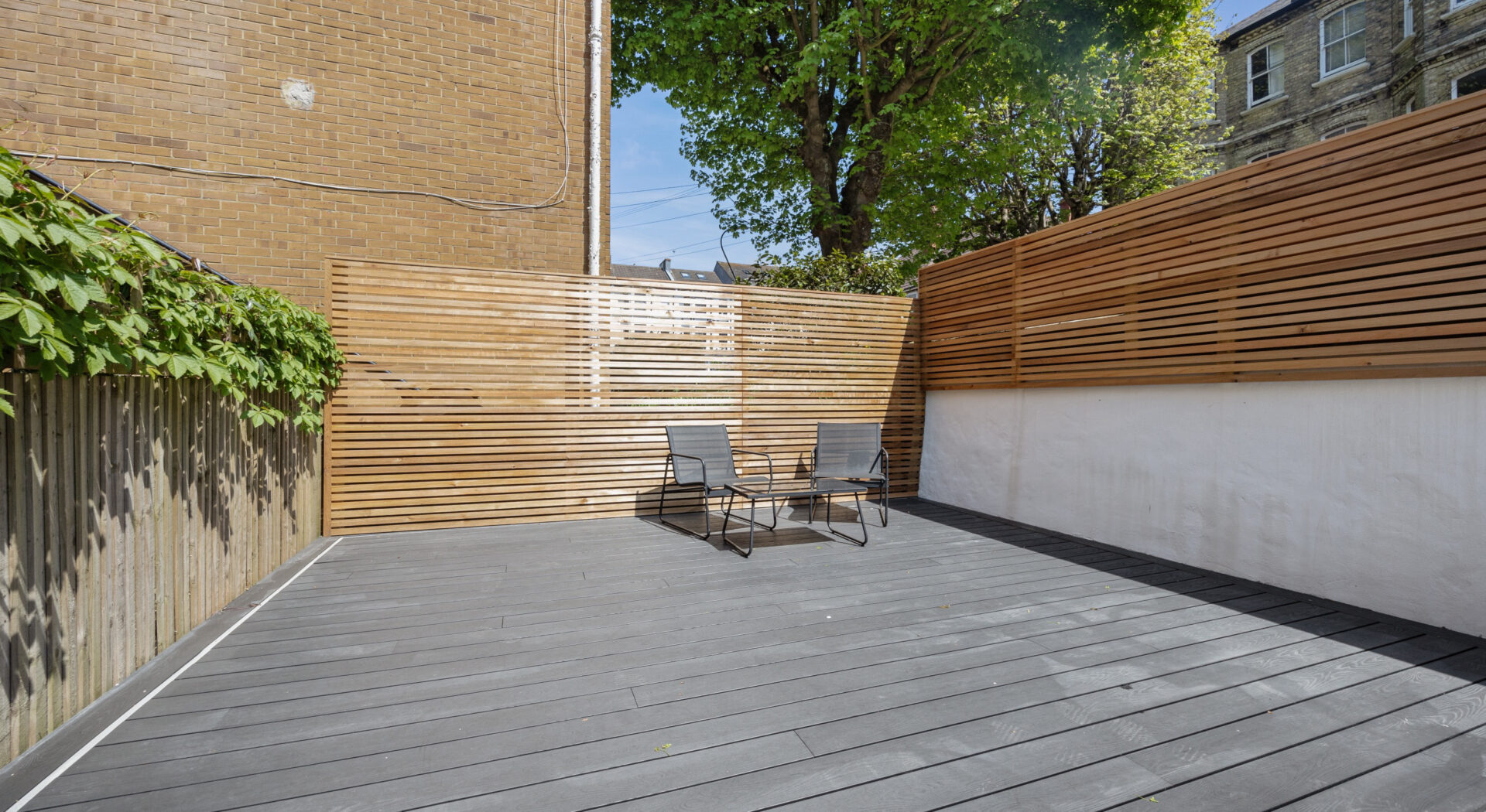 The bathroom has been thoughtfully designed with sophisticated marble-effect tiling, a luxurious walk-in shower with glass enclosure, heated towel rail, and a sleek floating vanity. The property’s standout feature is its exceptional outdoor spaces a modern patio with stone tiling, decked seating areas framed by contemporary fencing, and lush landscaped gardens with well maintained planters. These private, tranquil areas are ideal for relaxation or entertaining, offering a rare oasis in an urban setting.