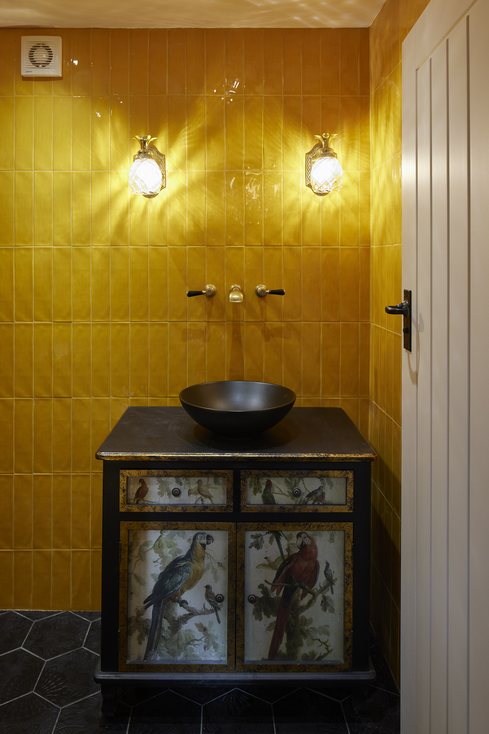 The bathroom is a striking feature, with vibrant yellow wall tiles, a bespoke vanity adorned with delicate bird illustrations, and a contemporary black bowl sink. High quality finishes and refined decorative touches provide a sense of individuality and style rarely found in commercial offices.