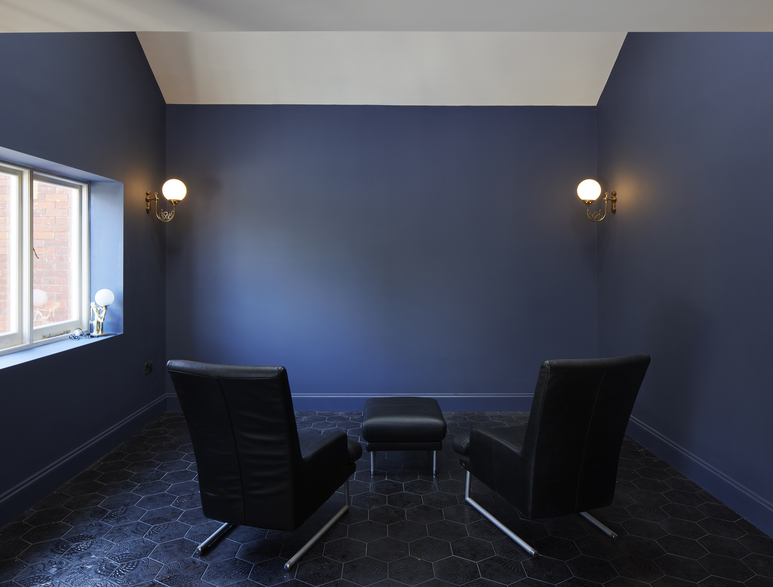 The open plan reception area features elegant hexagonal tile flooring and a convenient breakfast bar, ideal for informal meetings or coffee breaks.