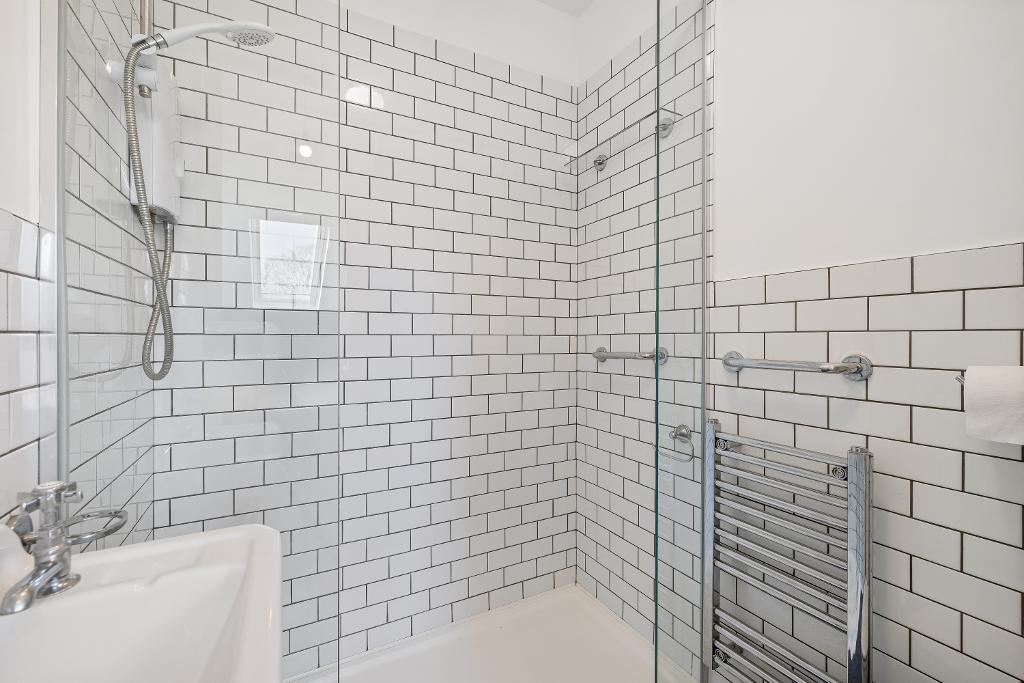 The bathroom continues the contemporary theme with a luxurious walk-in shower framed by a subway tile design and a chrome heated towel rail for added comfort. Additional highlights include built-in storage solutions and an overall sense of refined modernity balanced with beautiful period details. This flat presents an exceptional opportunity for those seeking a sophisticated and effortlessly stylish home.