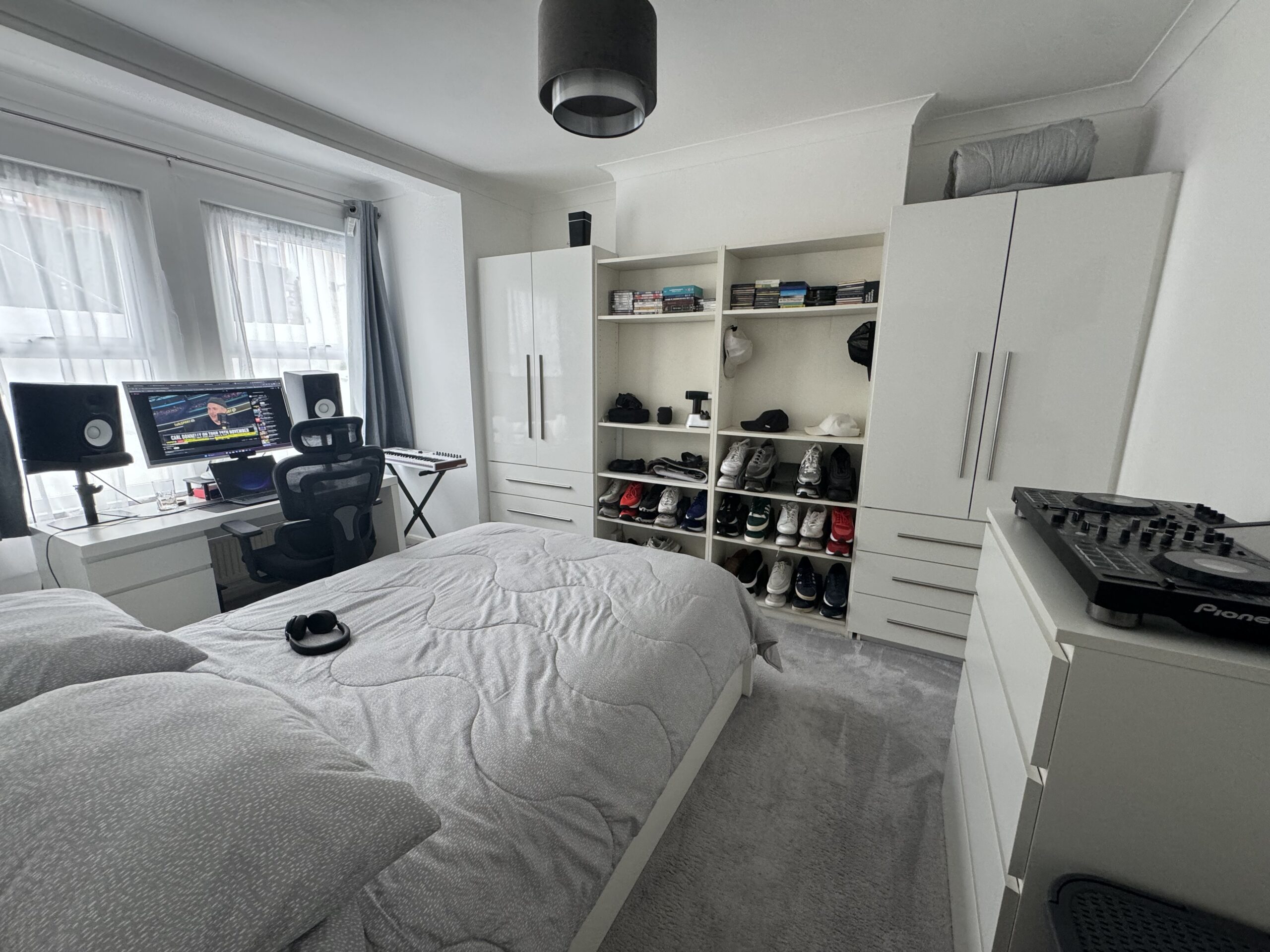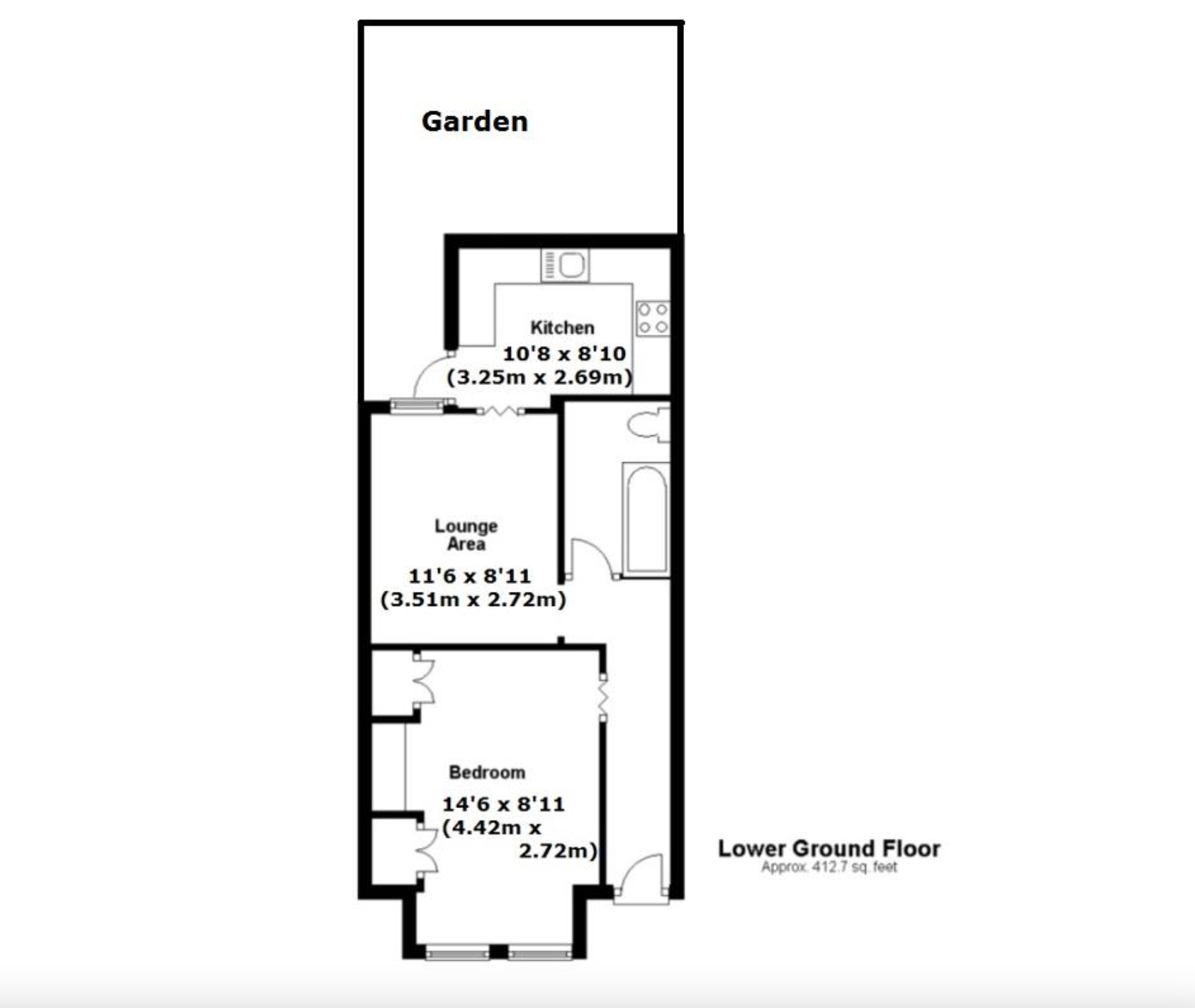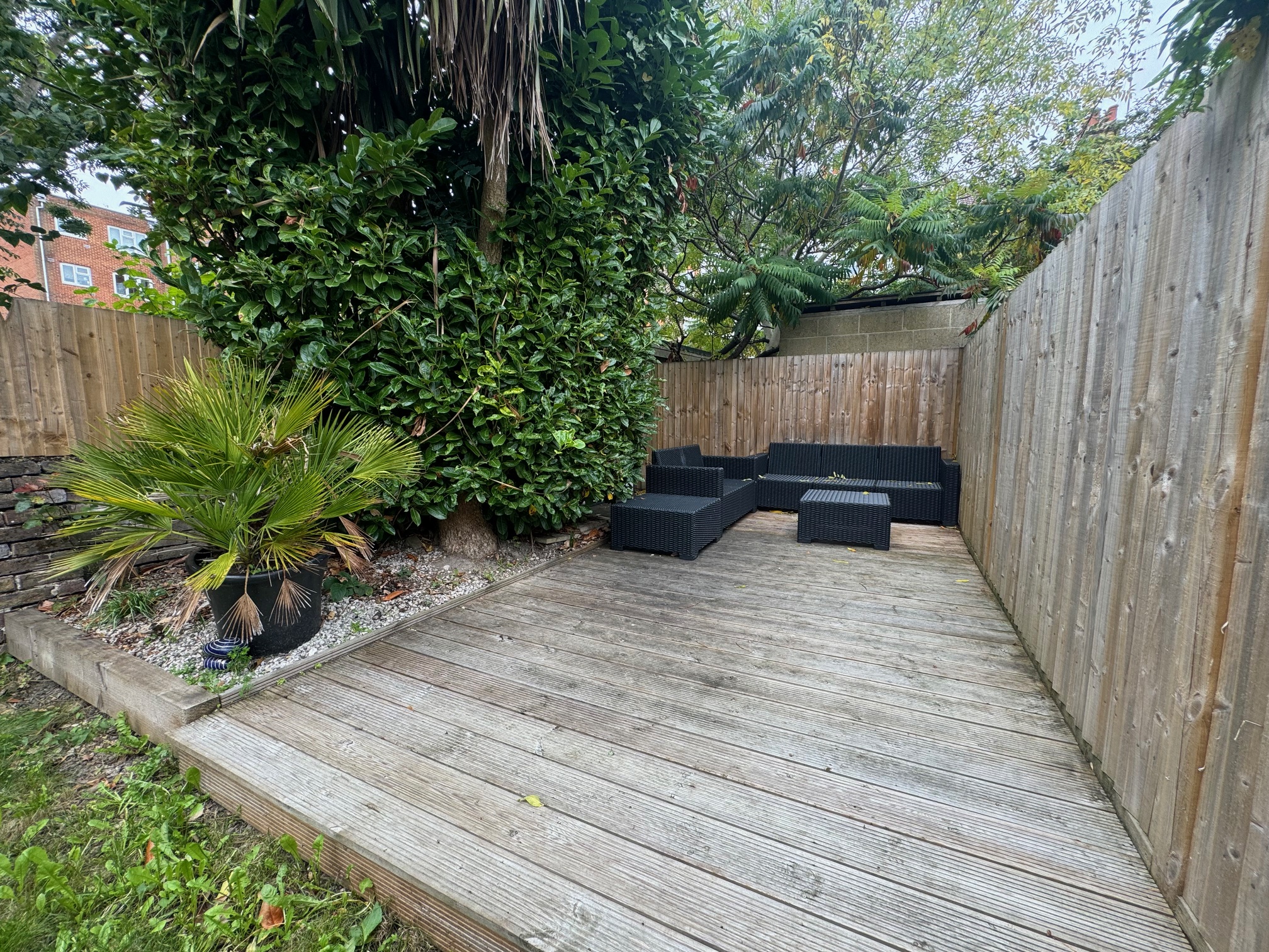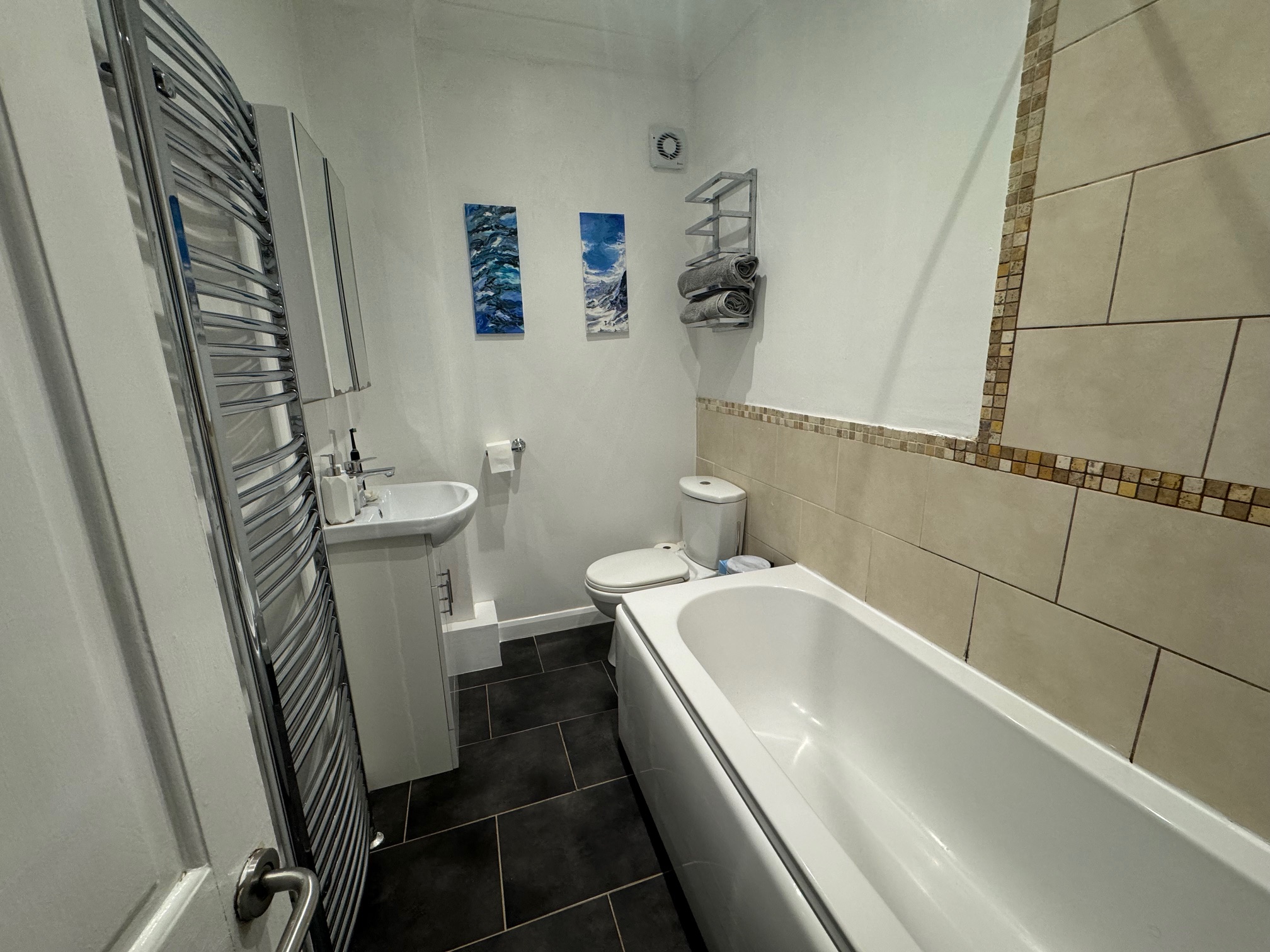 Step out the kitchen to discover a generous private garden, beautifully landscaped with mature trees and a lush lawn, offering a true sanctuary for outdoor living. The decked patio area and additional outdoor seating spaces are ideal for al fresco dining or tranquil evenings. The modern bathroom features tiled walls, a heated towel rail, and a comfortable bath-tub, providing a luxurious and functional retreat. Thoughtful touches such as built-in storage and basement access maximise practicality, while the property’s period character, including classic bay windows, adds undeniable kerb appeal. For added convenience, on-street parking is available. This exceptional flat is the perfect blend of style, comfort, and privacy, ready for its next discerning resident.
