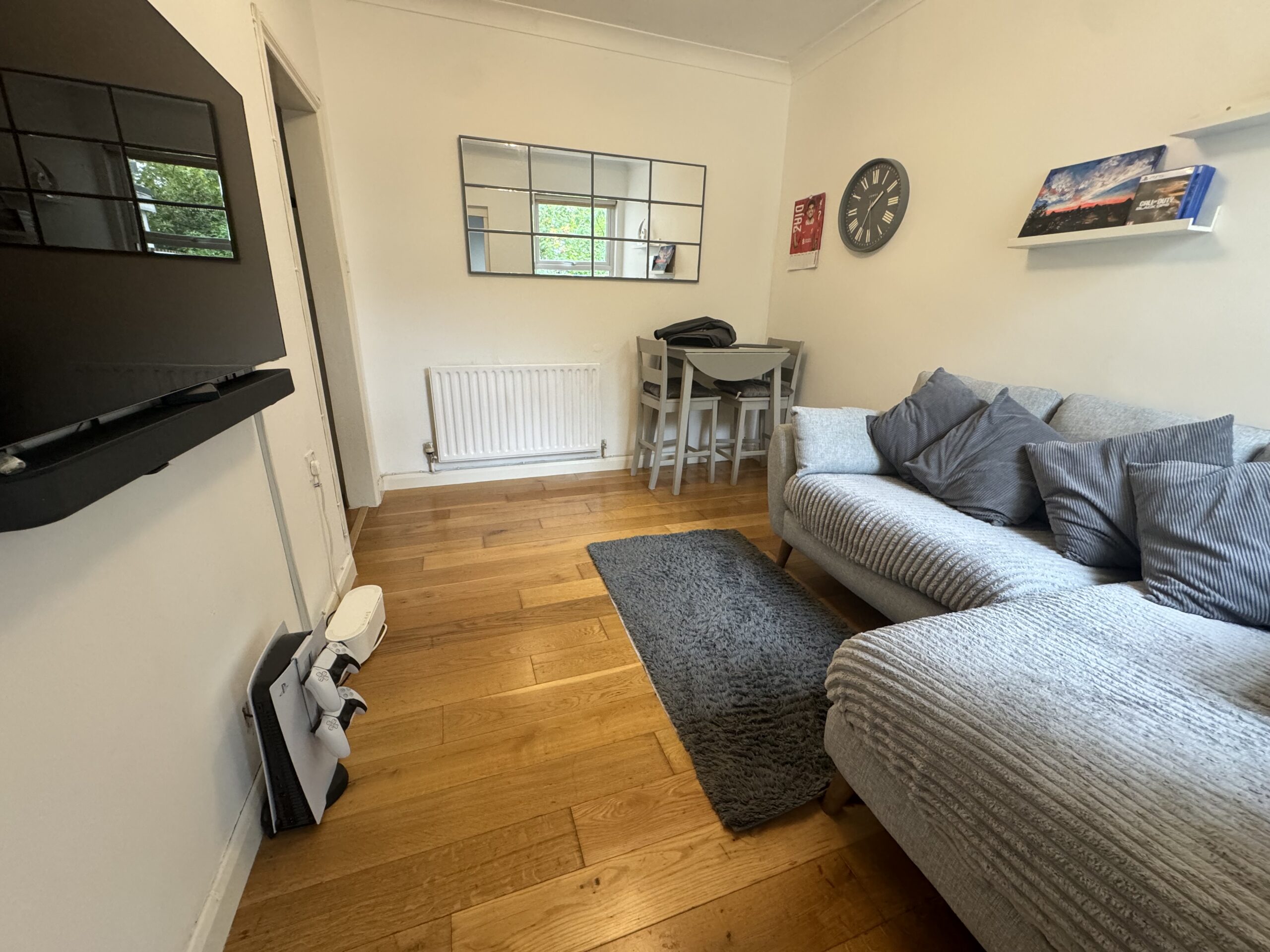 Presenting a truly distinctive one-bedroom flat that seamlessly blends period charm with contemporary comfort. This property is defined by its inviting open plan living area, where beautiful hardwood flooring and large bay windows flood the space with natural light. The living space offers a cosy sofa area and a modern wall-mounted TV, creating the perfect setting for relaxation or entertaining guests. The kitchen is thoughtfully designed with sleek modern units, integrated appliances, warm wooden countertops, and a stylish subway tile backsplash, all enhanced by ample natural light for a welcoming atmosphere.