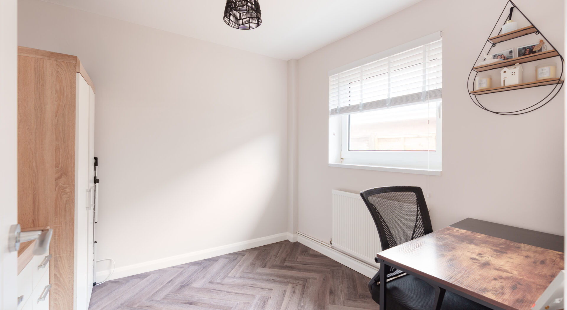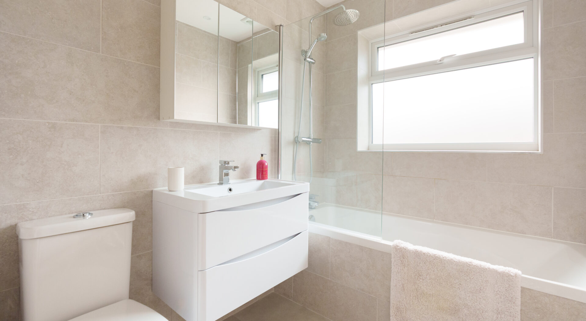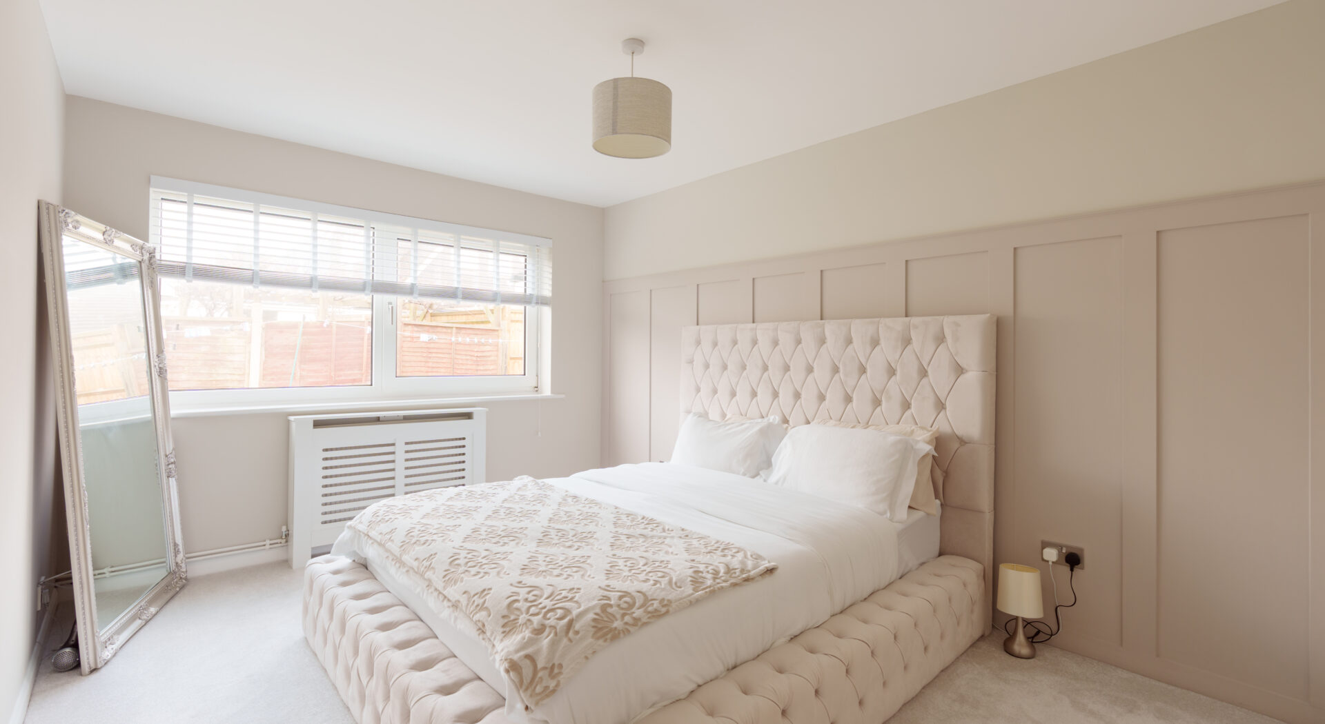 Three well proportioned bedrooms each offer their own inviting ambience: the principal bedroom features sophisticated wall panelling, while the additional bedrooms boast neutral décor, soft carpeting and excellent natural light. The contemporary family bathroom is equipped with a bath with shower over, floating vanity and a large mirror, all finished with modern fixtures and tasteful tiling.