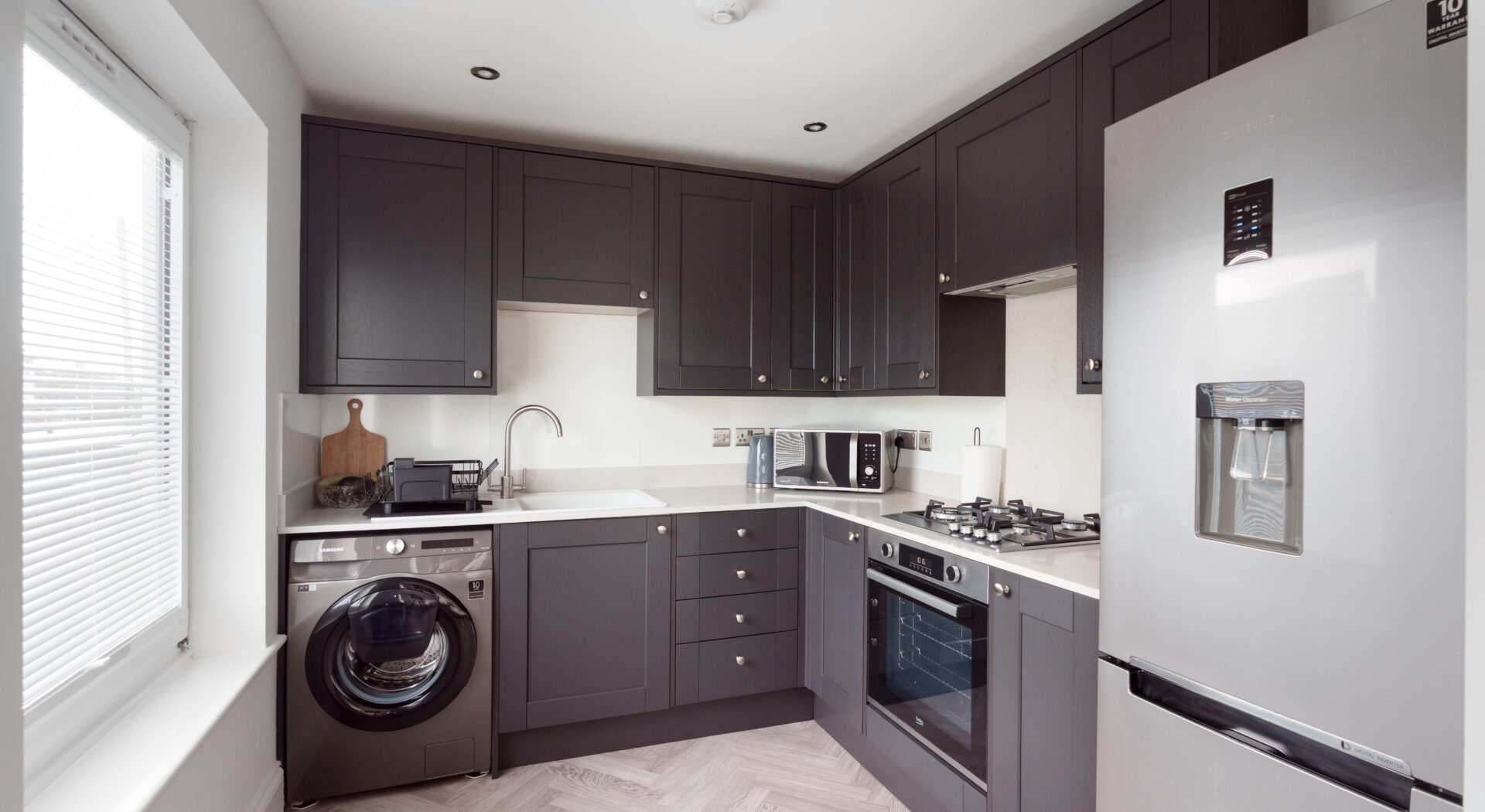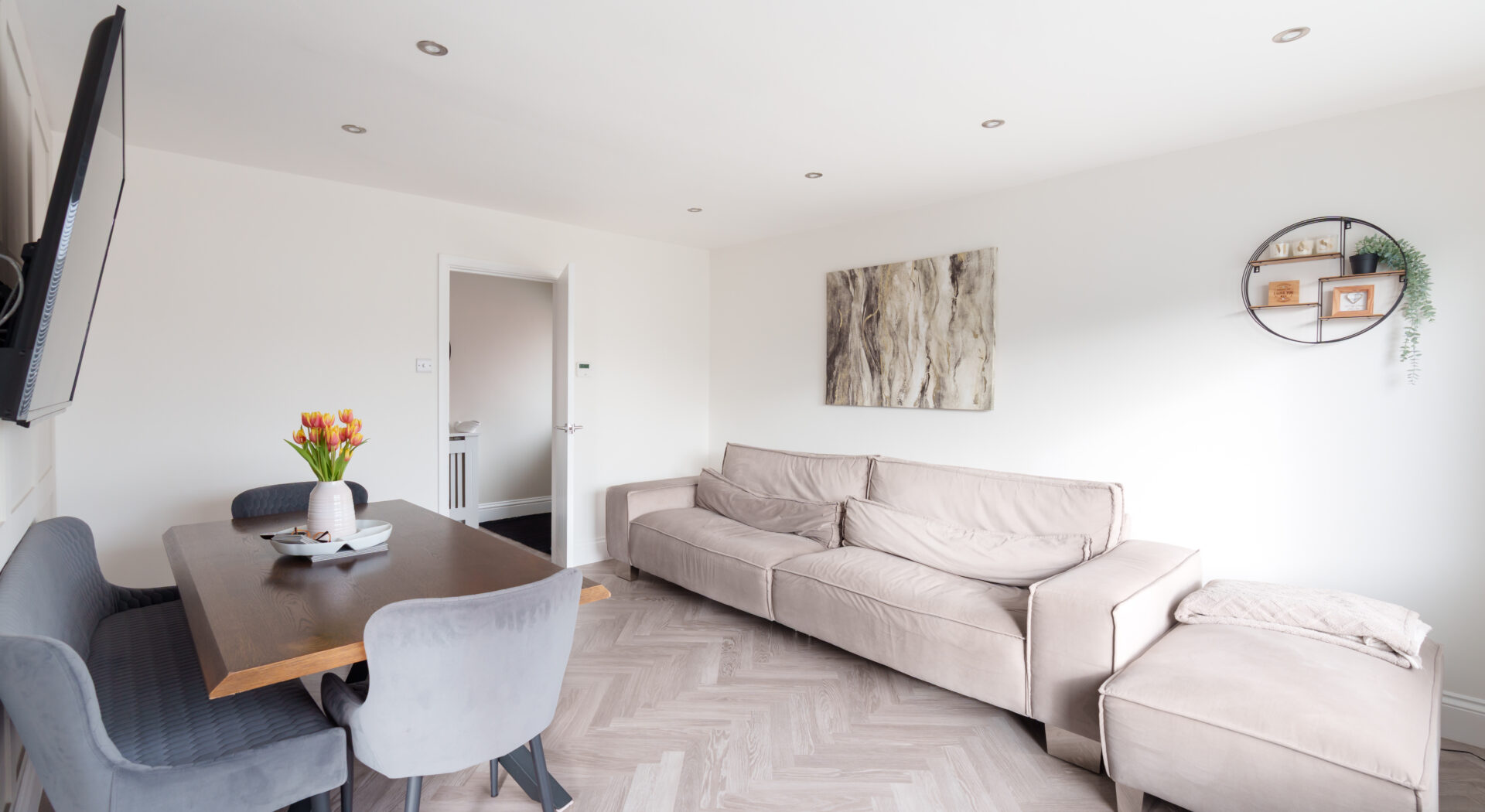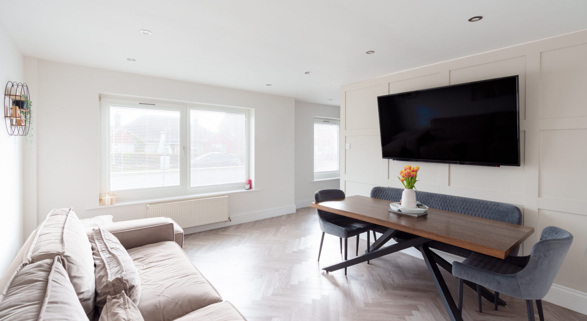 This beautifully presented three bedroom detached bungalow combines contemporary style with practical family living. Upon entering, you are welcomed by a bright hallway featuring ample built in storage and sleek design elements. The spacious open plan reception seamlessly integrates a comfortable living area with a modern dining space, both accentuated by elegant herringbone flooring, recessed lighting and abundant natural light from large windows. The stylish kitchen impresses with its dark Grey cabinetry, Quartz worktops, and generous workspace illuminated by natural light, making it the heart of the home.