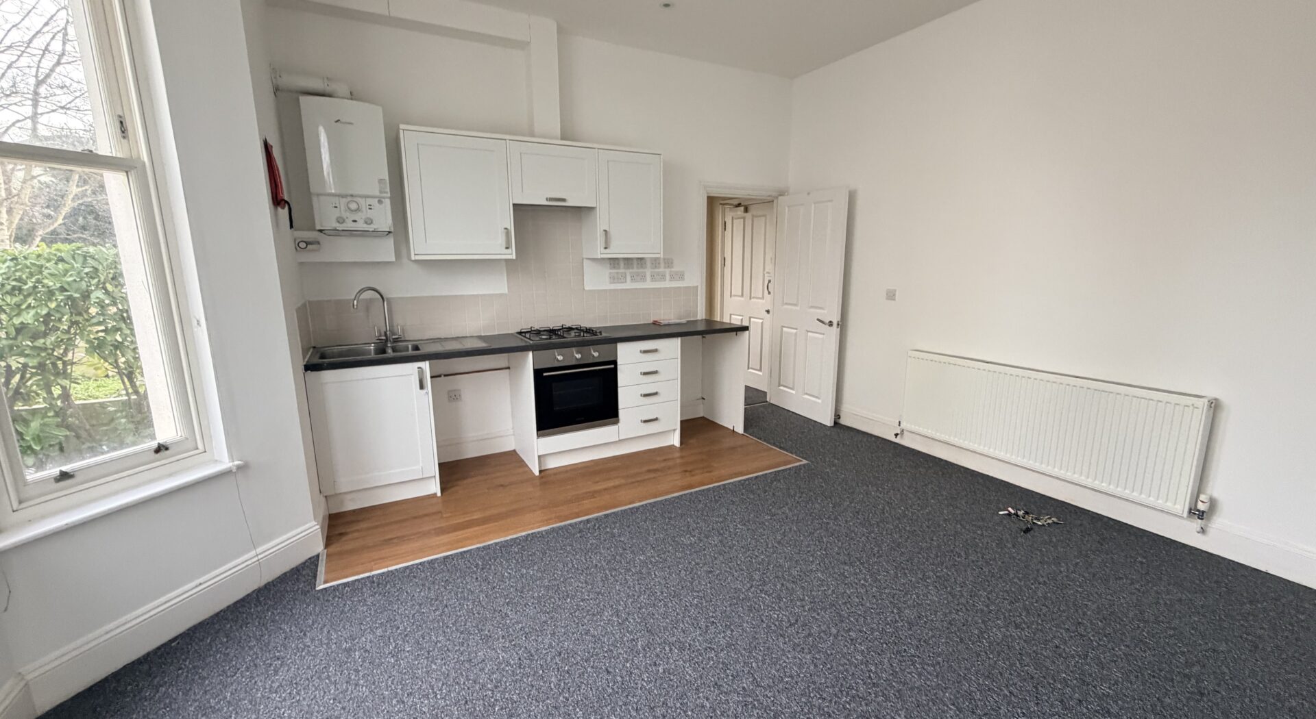 Redecorated one bedroom apartment on Mill Road, Worthing. High ceilings, sash bay windows, modern kitchen and bathroom, communal parking. Close to town, transport and seafront. Available now.