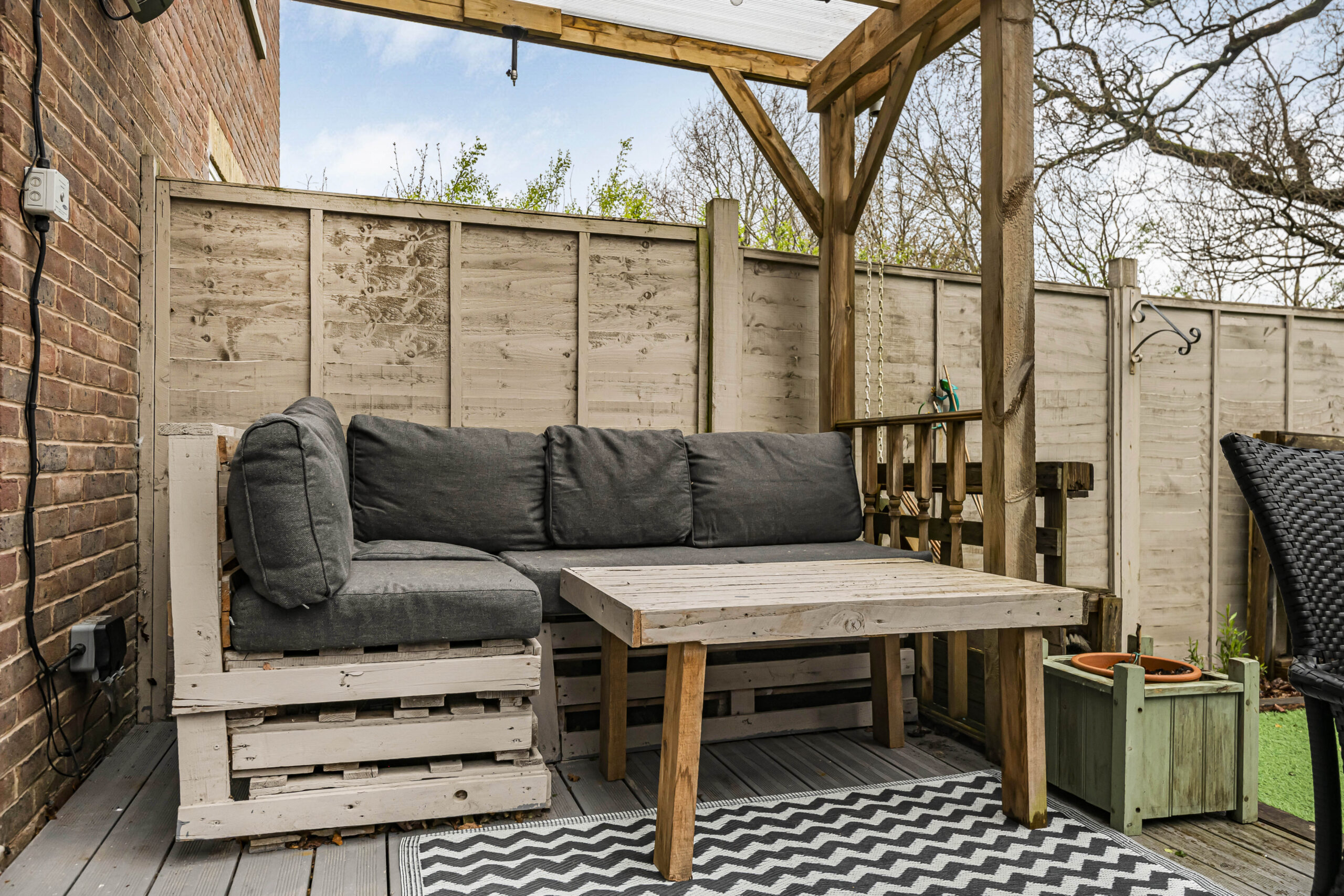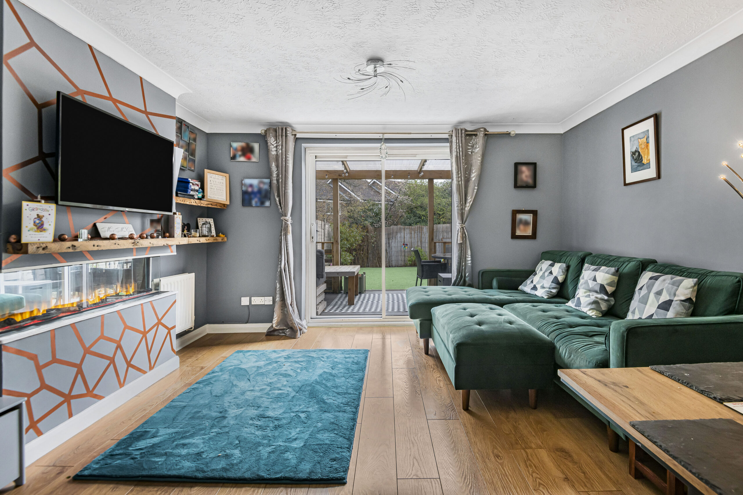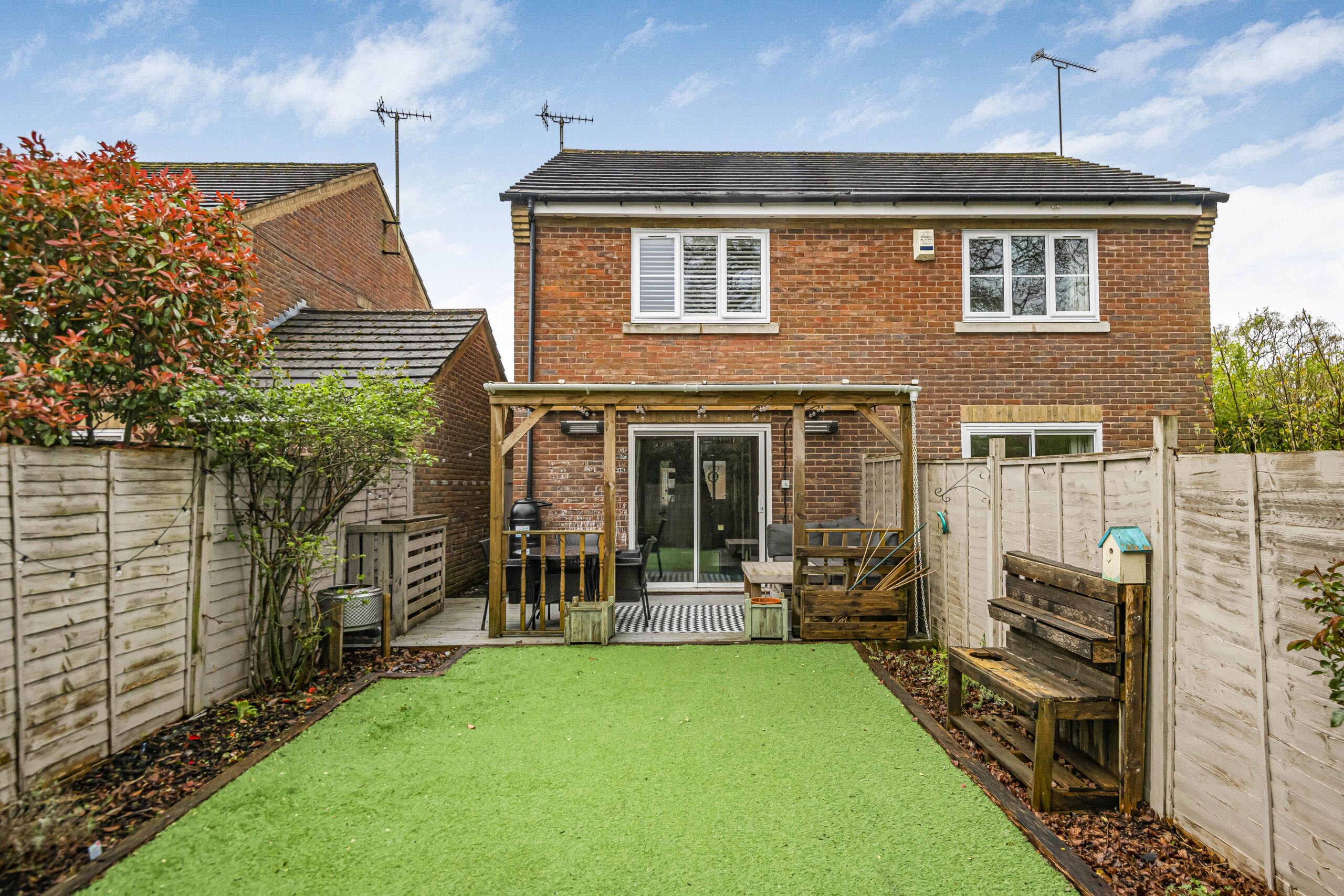 Presenting an exceptional two-bedroom semi-detached house, this beautifully maintained home offers a wonderful blend of modern design, practical features, and inviting outdoor spaces. The spacious open-plan reception room is the heart of the home, featuring elegant wood flooring and a contemporary electric fireplace for cosy evenings. Expansive sliding glass doors flood the space with natural light and open directly onto a covered patio and landscaped garden, creating seamless indoor-outdoor living, perfect for relaxing or entertaining guests.