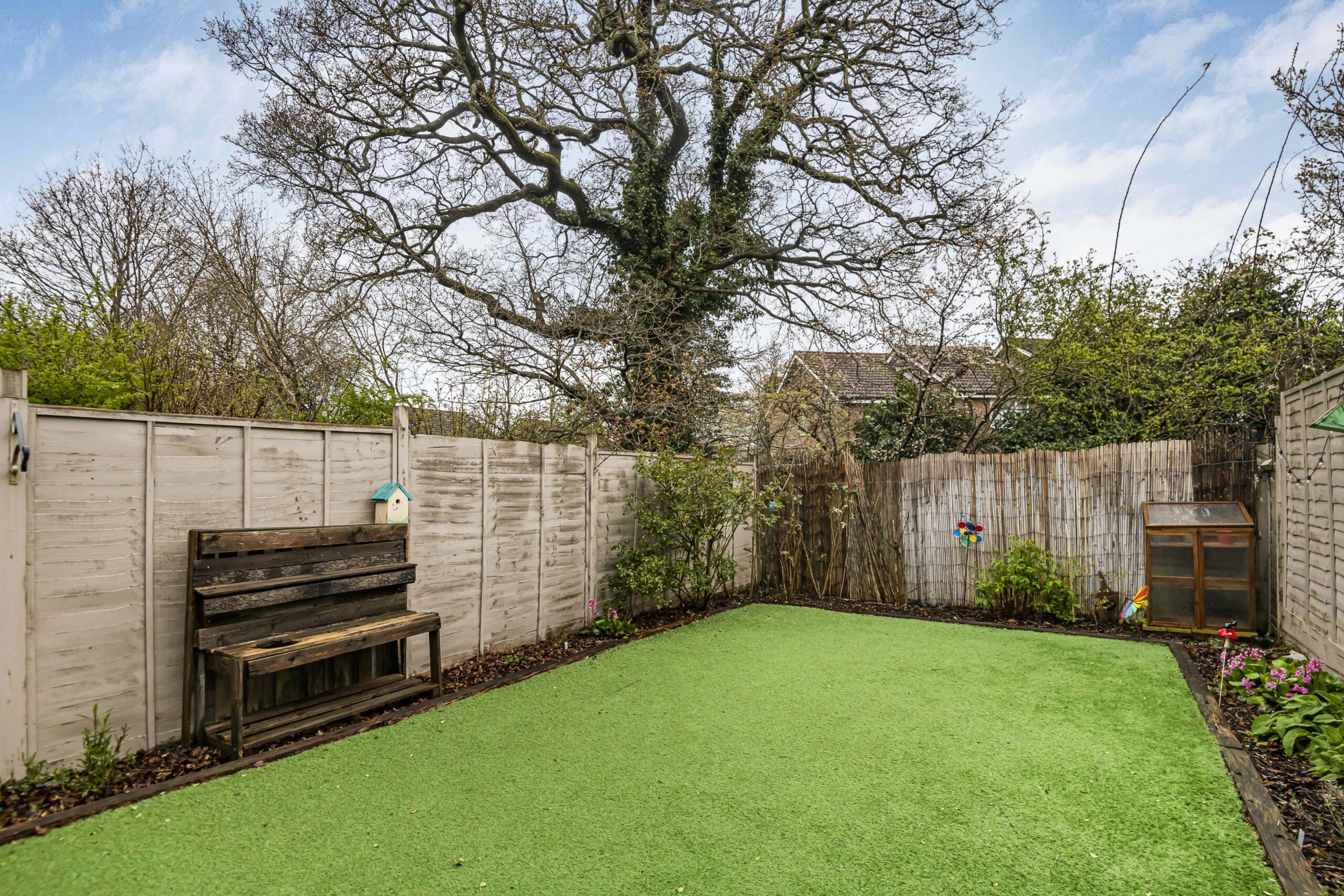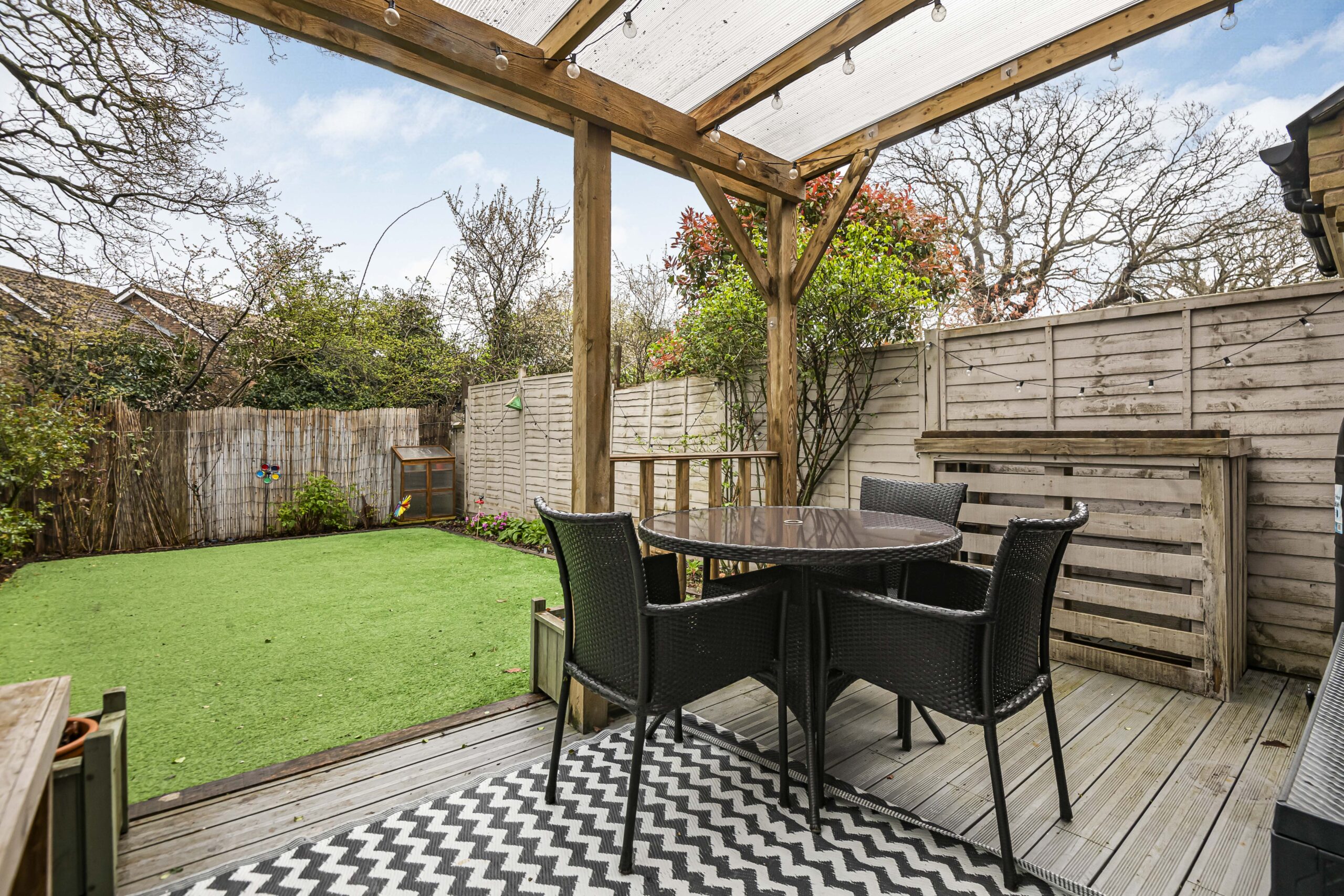 The sleek, modern kitchen is fully equipped with integrated appliances, including a gas hob and oven, and boasts ample cabinet storage as well as stylish finishes throughout. Both bedrooms provide generous accommodation, with large windows and built-in storage in the second bedroom, while the family bathroom features a modern bath with overhead shower and quality fixtures. Externally, the property delights with a private, low maintenance artificial lawn, covered outdoor seating and dining areas, and privacy fencing for tranquil enjoyment. Off-road parking, a garage, EV charging point and exceptional kerb appeal complete this outstanding home, making it an ideal choice for discerning buyers seeking space, style, and convenience.