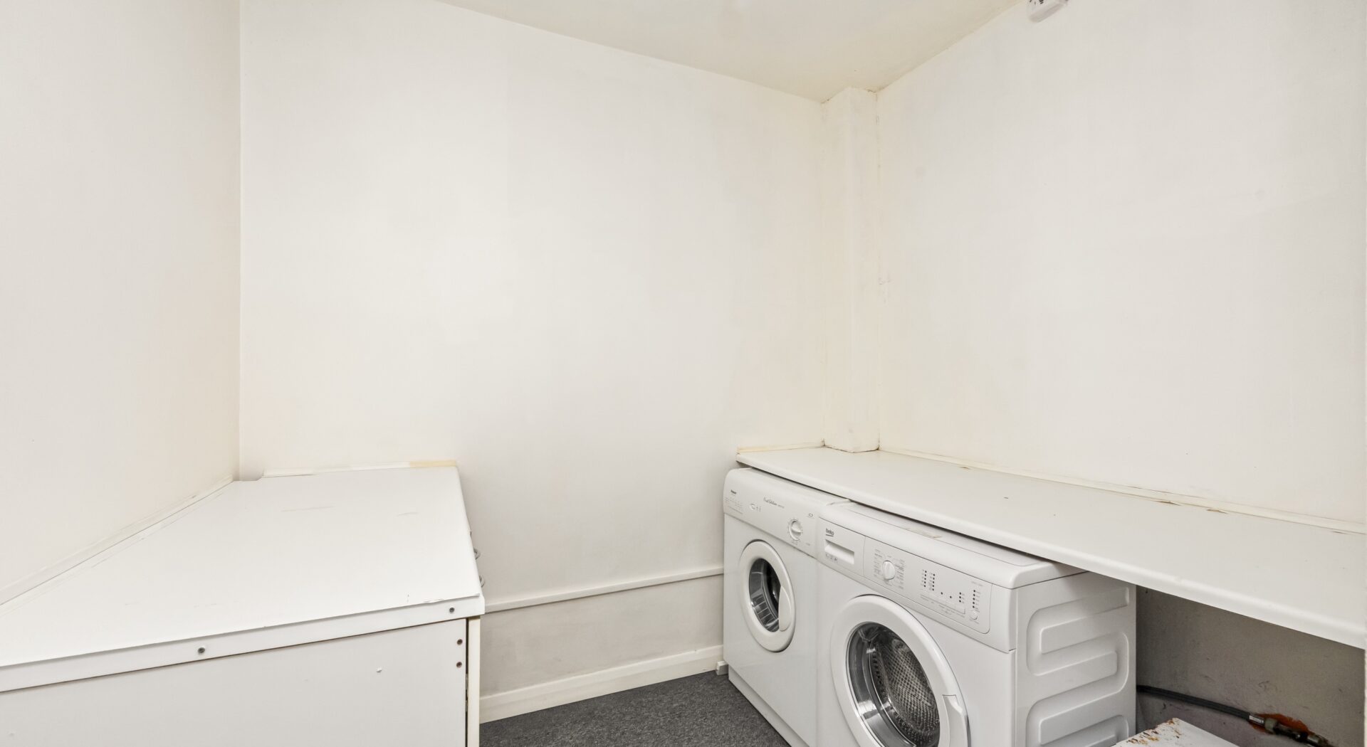 The kitchen is practical, featuring wooden cabinetry, a modern integrated oven, gas hob, and sleek extractor fan, all illuminated by a generous window that brings in ample day light. The bathroom has a modern bath-tub with a dark tiled backsplash, complemented by minimalist design and neutral tones. A dedicated utility room comes complete with a washing machine, dryer, and plenty of countertop space, streamlining household tasks. The inviting hallway, with freshly painted walls and plush carpeting, adds comfort and warmth as you move through the home.