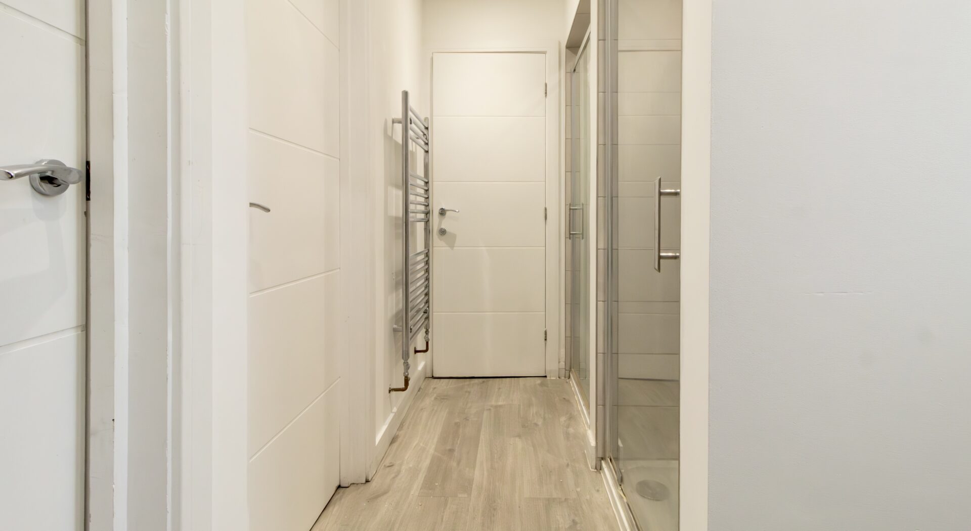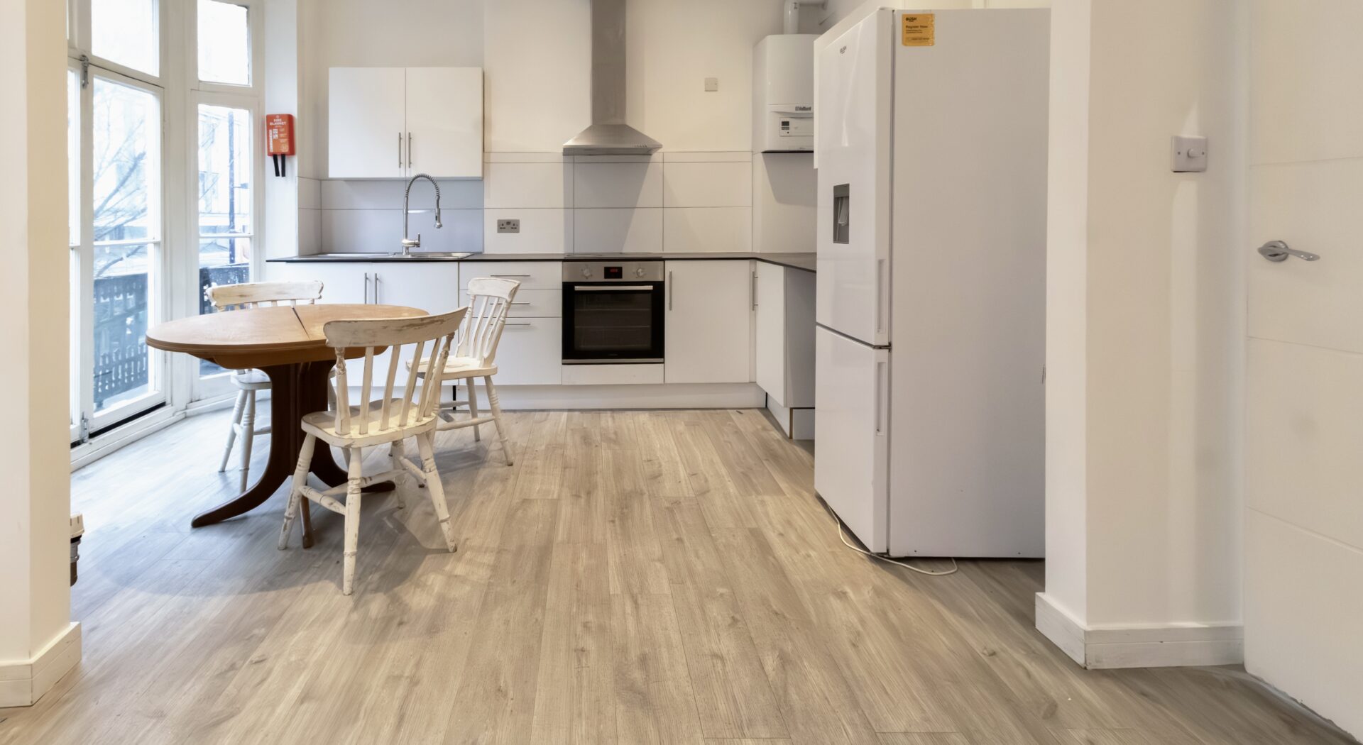 The first floor features a bright, bay fronted lounge that flows into an open plan kitchen/dining space, offering plenty of room for a dining setup. The modern kitchen is finished in sleek high gloss white units and includes an integrated oven, hob, and fridge/freezer. Also on this level is a W/C positioned beside a shower area that includes two individual shower cubicles.