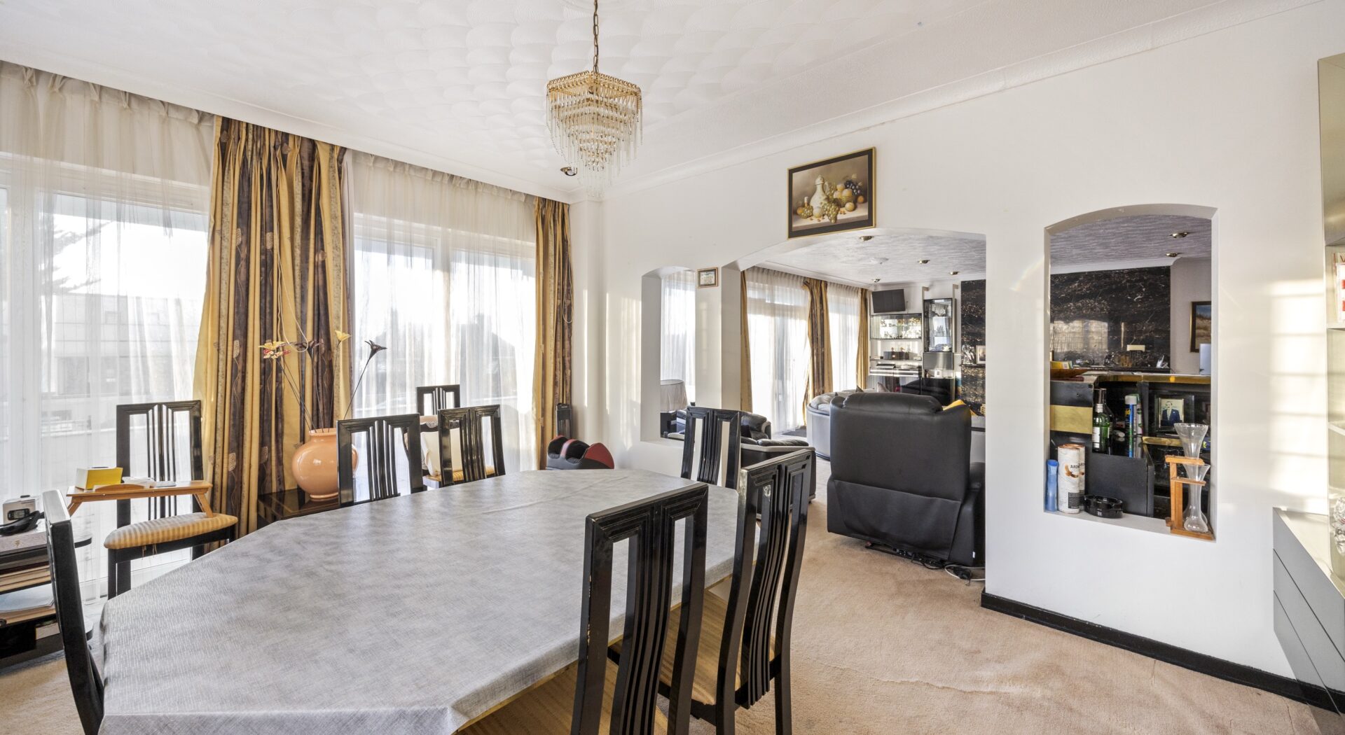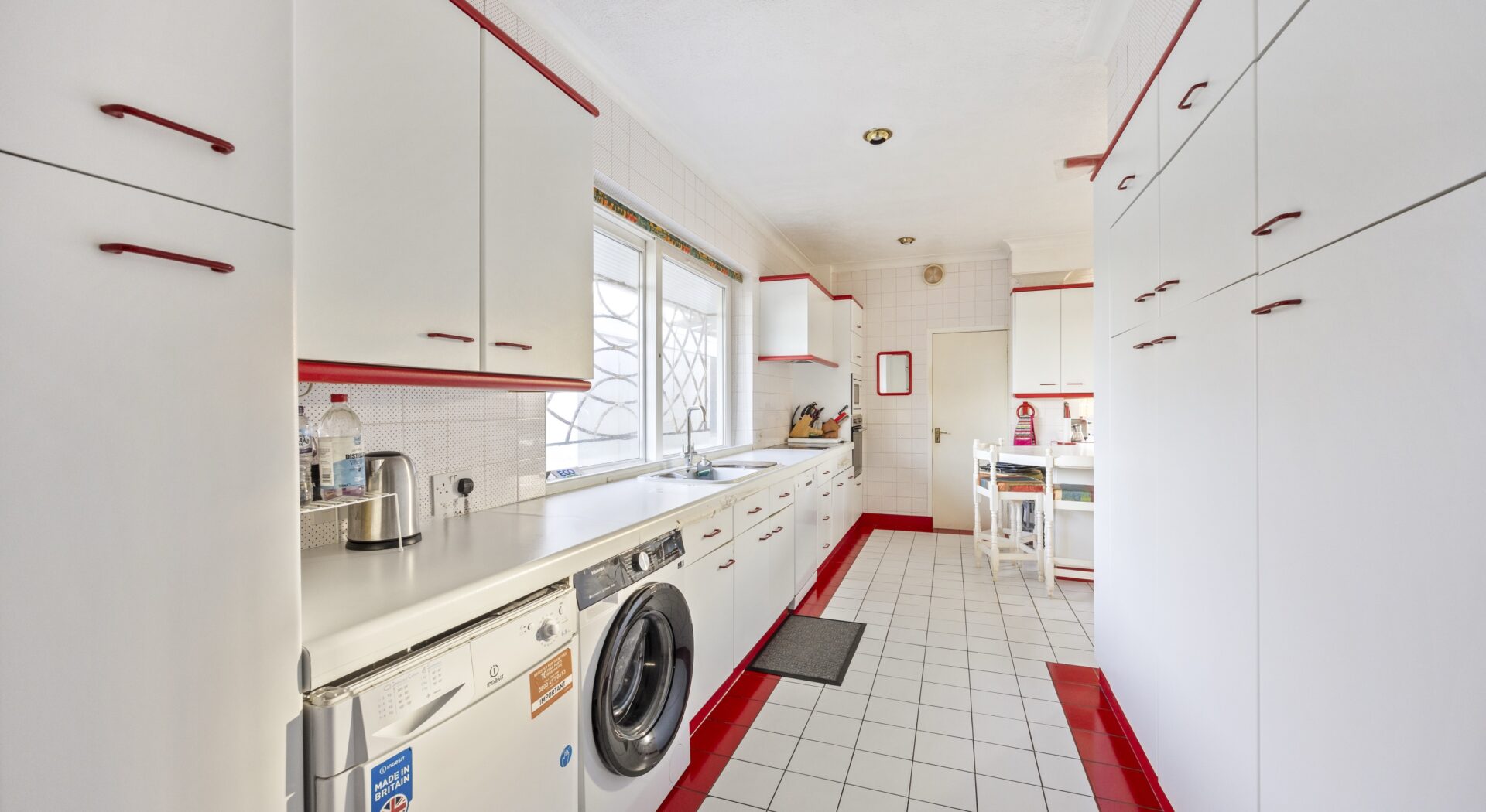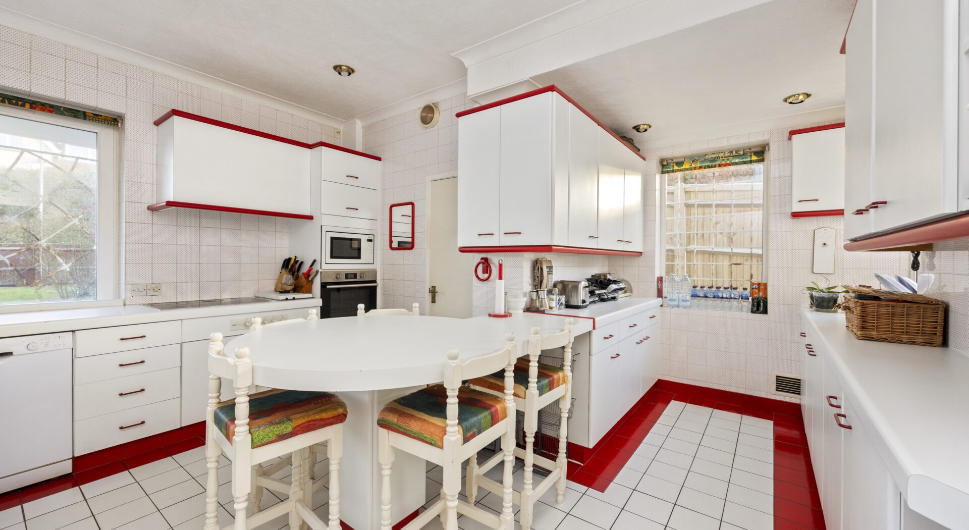 The kitchen sits at the heart of the home and offers generous storage, integrated appliances and space for a dining table with large windows overlooking the garden. While functional, this space offers clear potential to be reimagined into a contemporary, high-end culinary hub befitting the scale of the property.