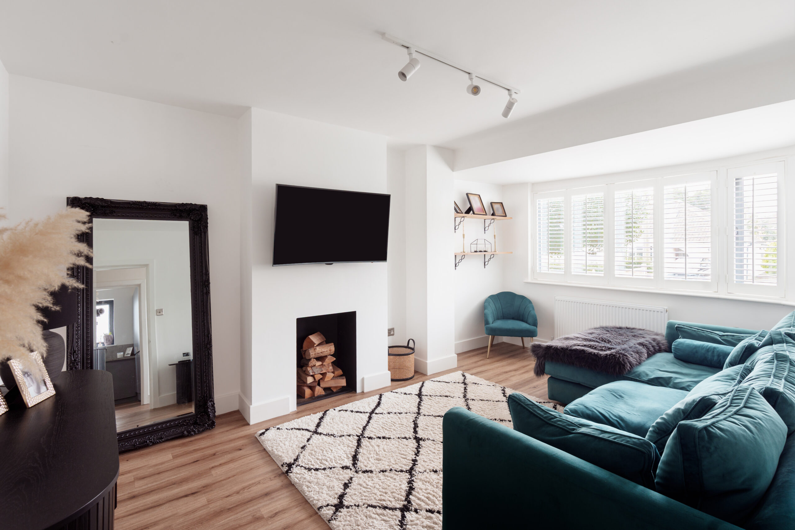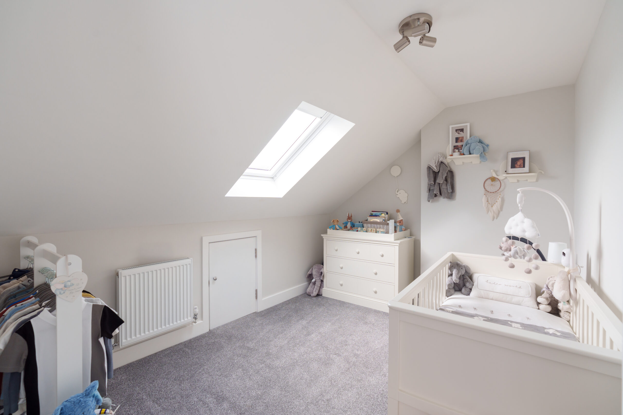 Inside, the property continues to impress with a contemporary living room highlighted by a sleek modern fireplace and elegant decor. The bedrooms benefit from built-in wardrobes and ample natural light, with a dedicated nursery offering custom storage and a Velux window. Both bathrooms are finished to a high standard, featuring a luxurious walk-in shower, a relaxing bath-tub, and modern fixtures throughout. Added conveniences include off-road parking and additional built-in storage, ensuring this home delivers both style and practicality for family life or entertaining guests.