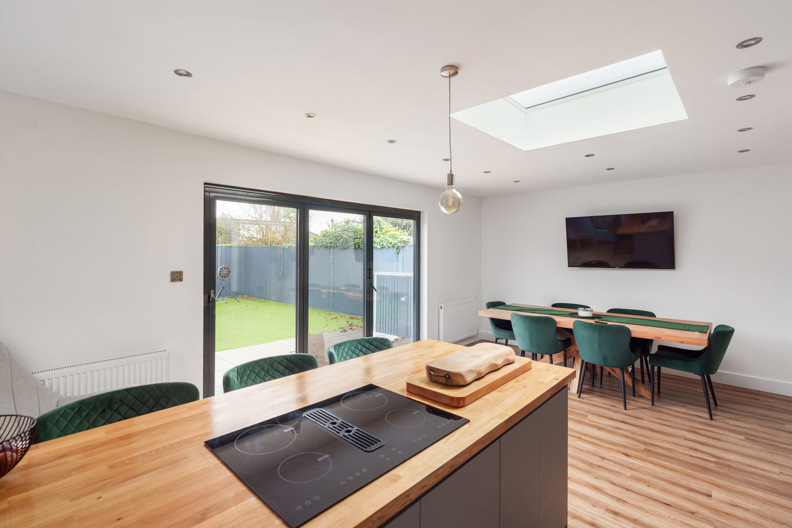 Experience exceptional modern living in this beautifully presented three-bedroom, three-bathroom semi-detached house. The heart of the home is a spacious open plan kitchen and dining area, thoughtfully designed with a stylish kitchen island and integrated appliances. Large skylights and expansive windows flood the space with natural light, while bi-fold and sliding doors offer seamless access to a landscaped private garden. The garden itself features a low-maintenance artificial lawn, a generous patio perfect for al fresco dining, and privacy fencing to create a tranquil outdoor retreat.
